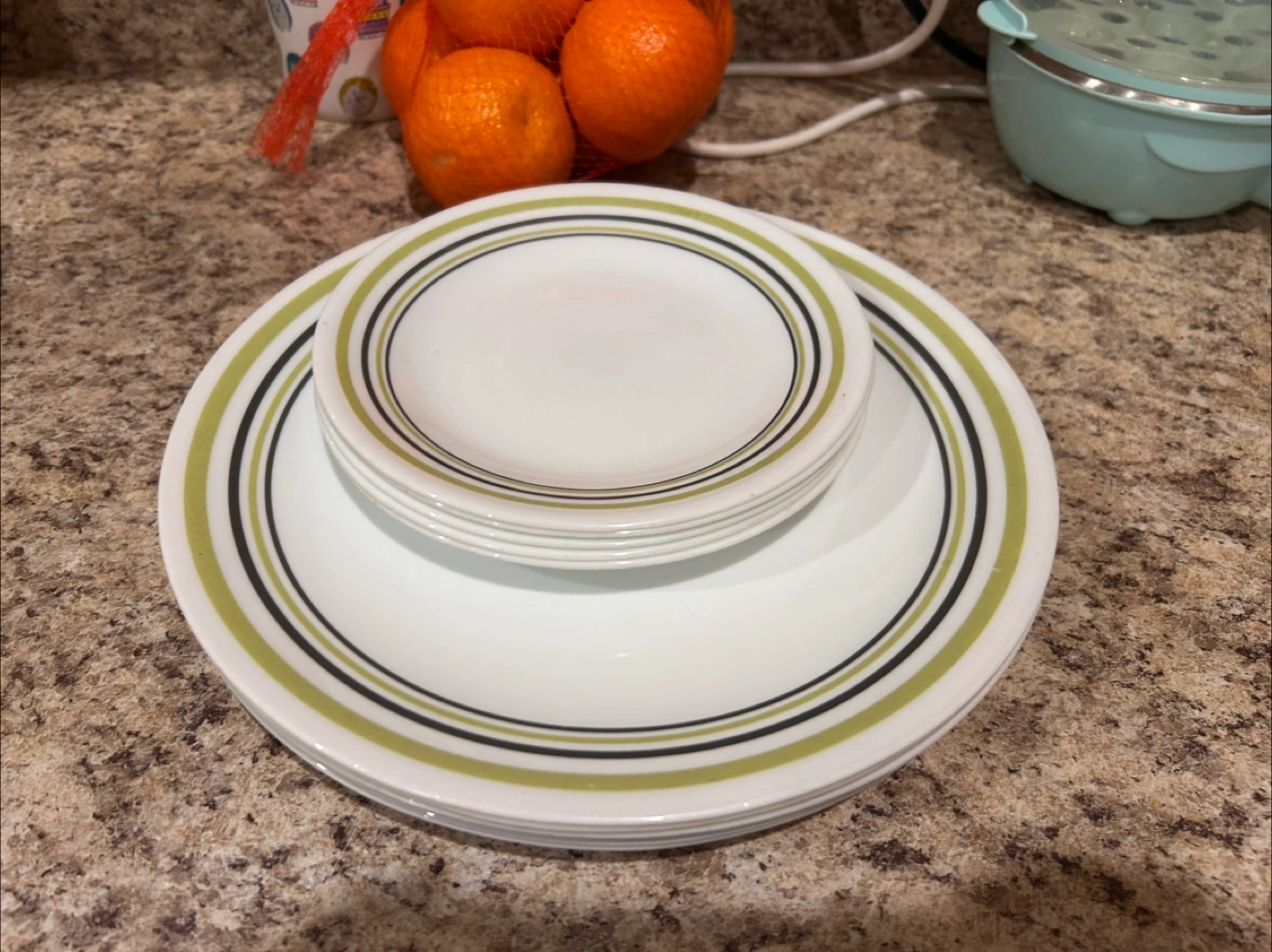 Corelle plates with green and black stripes