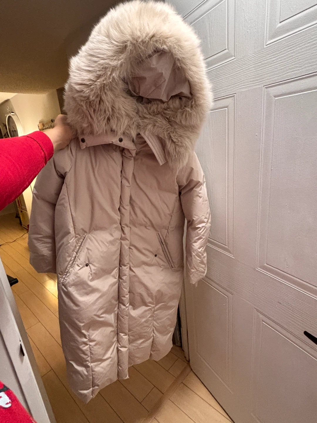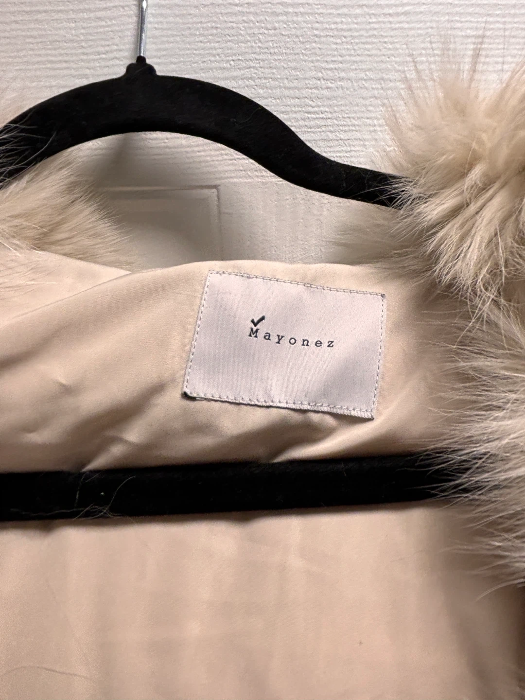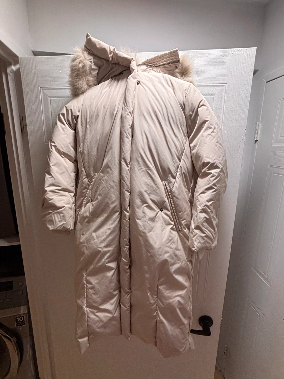 This is a Mayonez women's long puffer coat in a light beige colour. It features a detachable faux fur trim on the hood. It's a stylish and warm option for colder weather.
