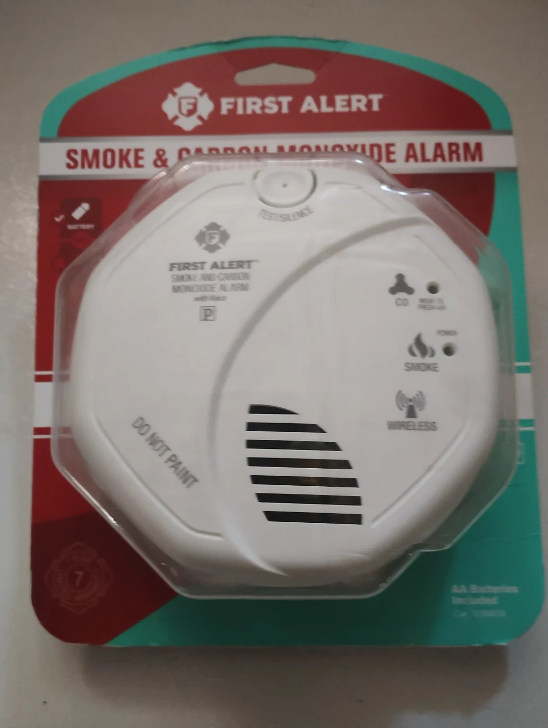 First Alert Smoke and Carbon Monoxide Alarm. Includes AA Batteries. Wireless enabled. "Do Not Paint" warning is visible.