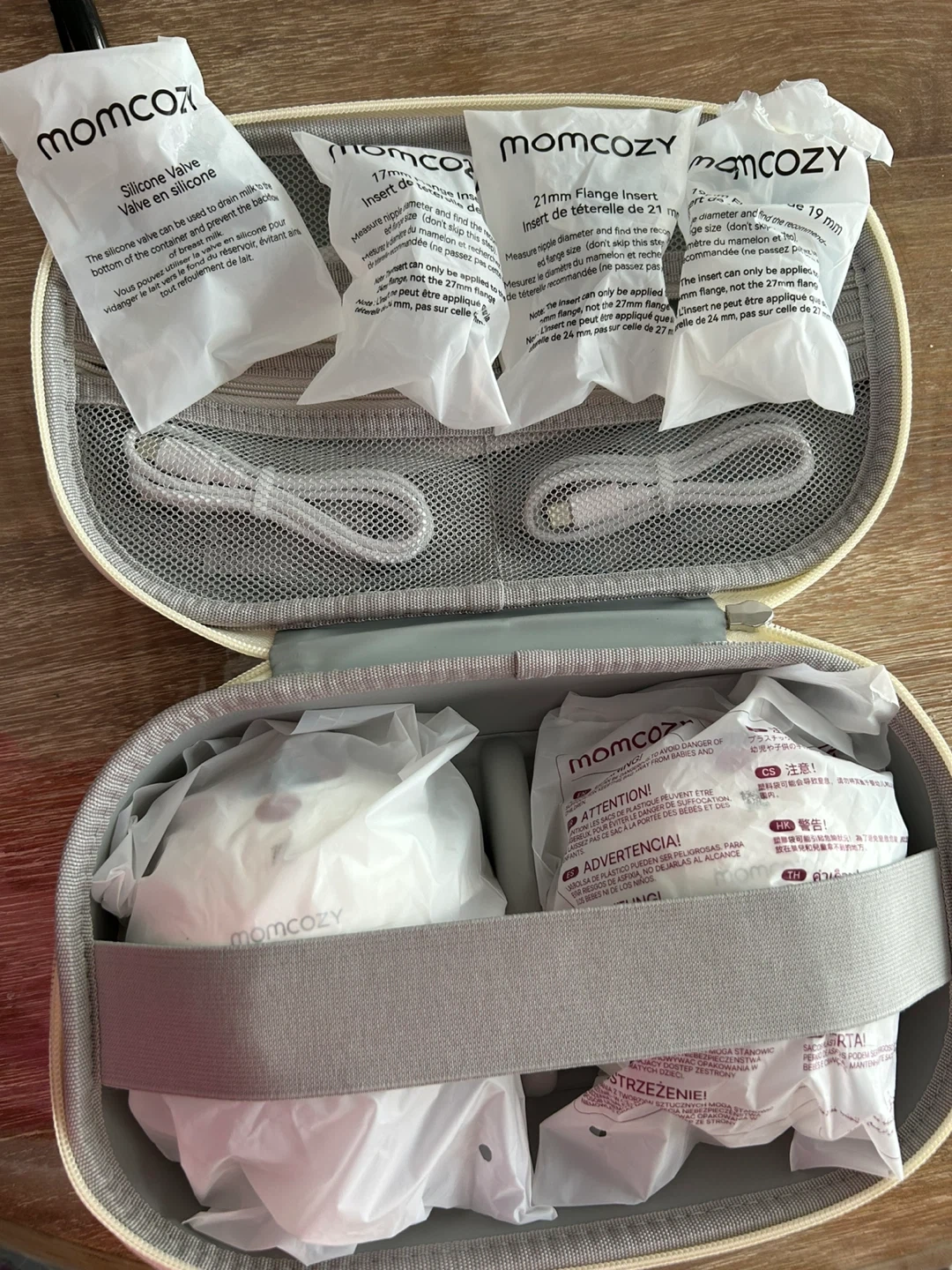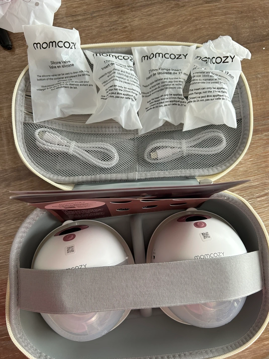 Momcozy wearable breast pump in gray. This 2-count set includes multiple flange sizes: 17mm, 19mm, and 21mm, along with a nipple measure tool. It's a portable solution for milk expression.