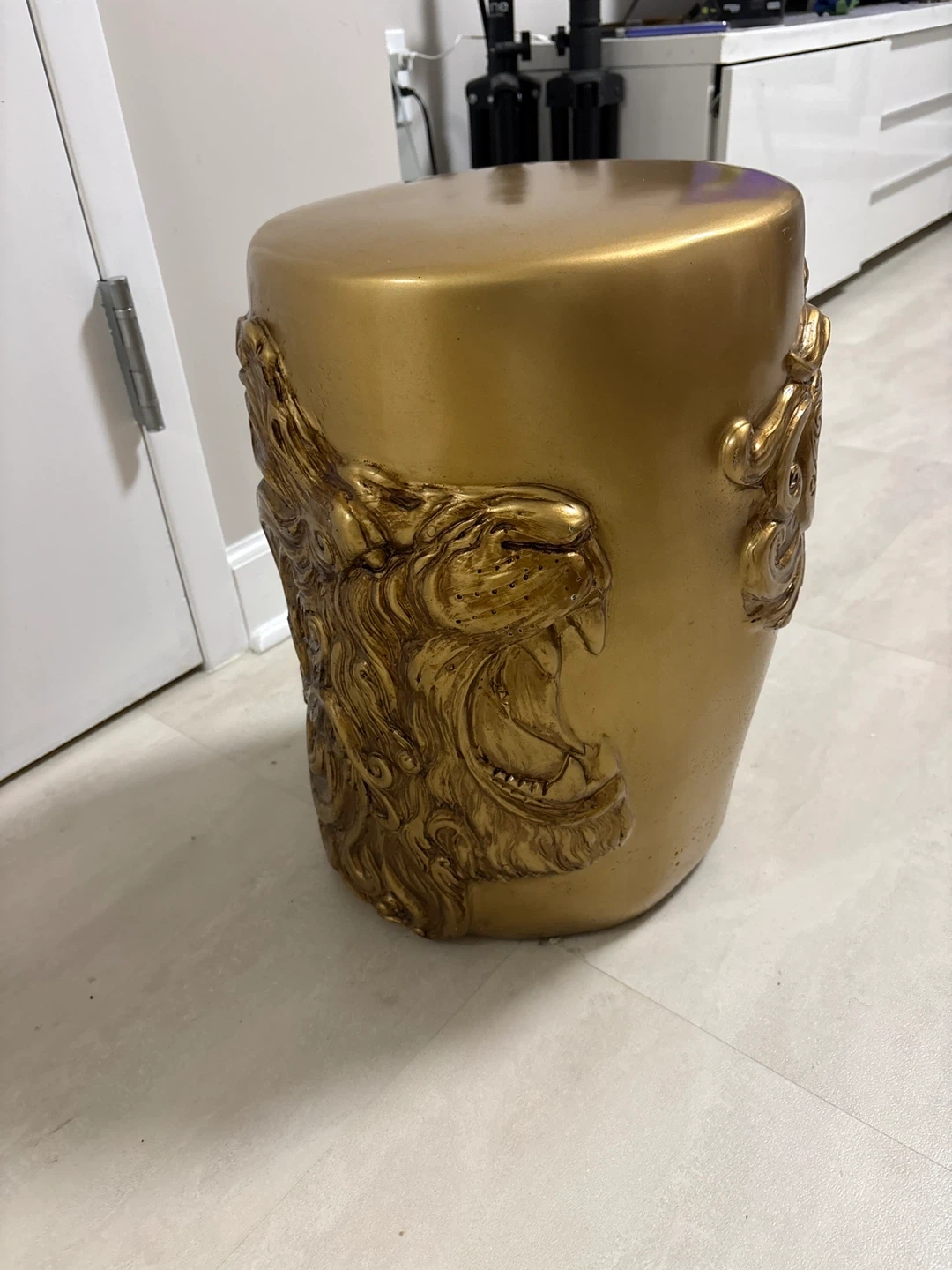 This gold ceramic garden stool features an ornate embossed lion head design. It's a decorative and functional accent piece. Ceramic material.