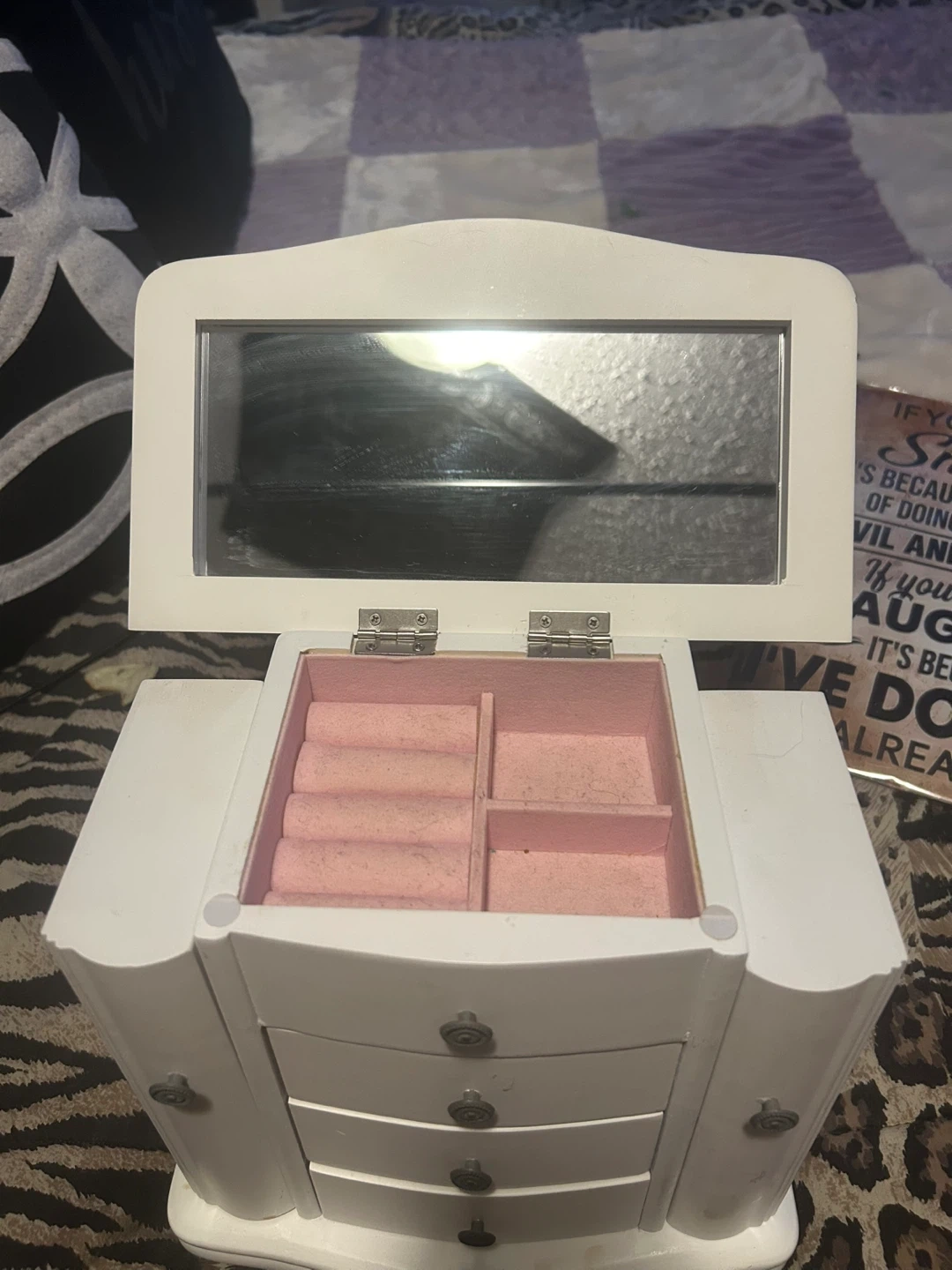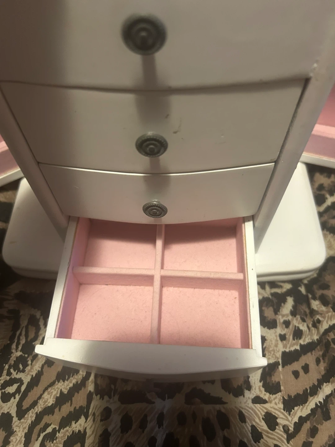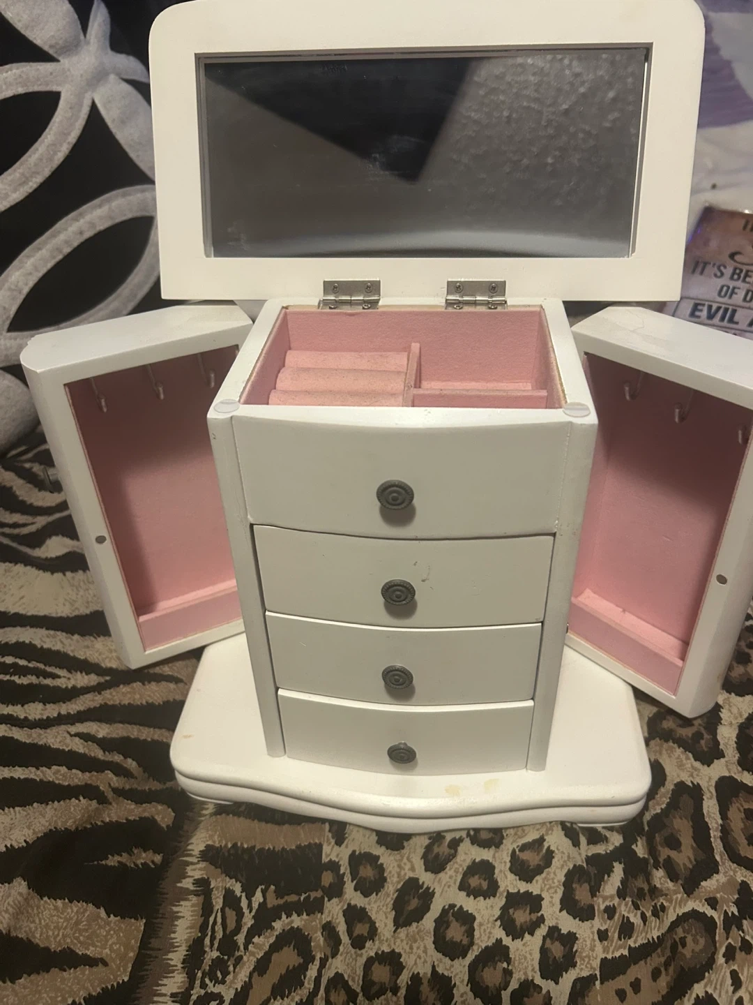 This white jewellery box features a mirror and multiple drawers for storage. It's lined with pink felt and has side compartments for necklaces or earrings. Keeps your trinkets organized!