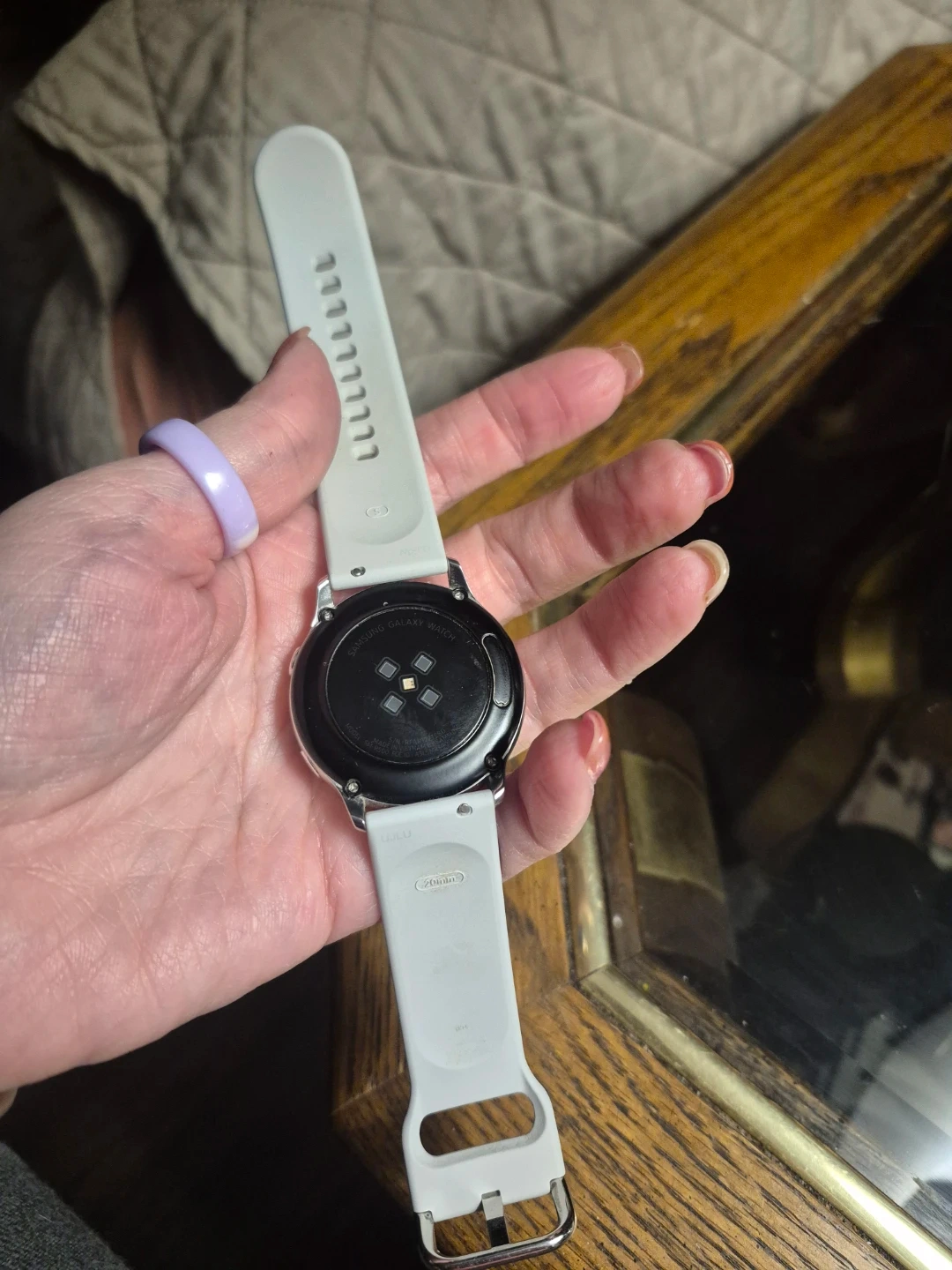 This is a Samsung Galaxy Watch Active 2 smartwatch. It's a silver 40mm model with a white silicone band. The watch comes with its charging cable and original box. It's great for tracking your fitness and staying connected on the go!
