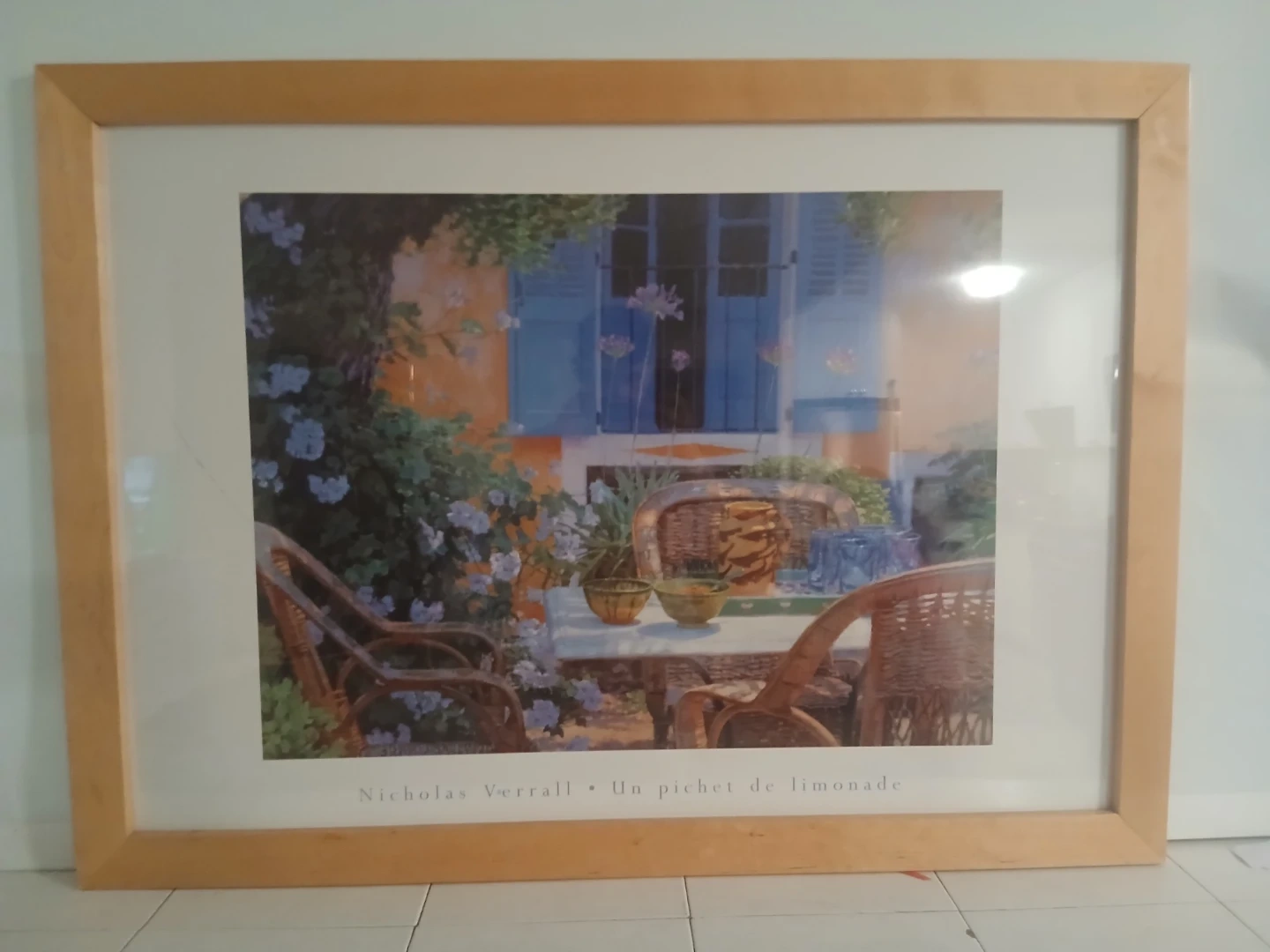 Framed print titled "Un pichet de limonade" by Nicholas Verrall. Features a charming scene of a patio setting with wicker chairs and a table. The artwork is presented in a light wood frame. This piece would brighten up any room in your home!