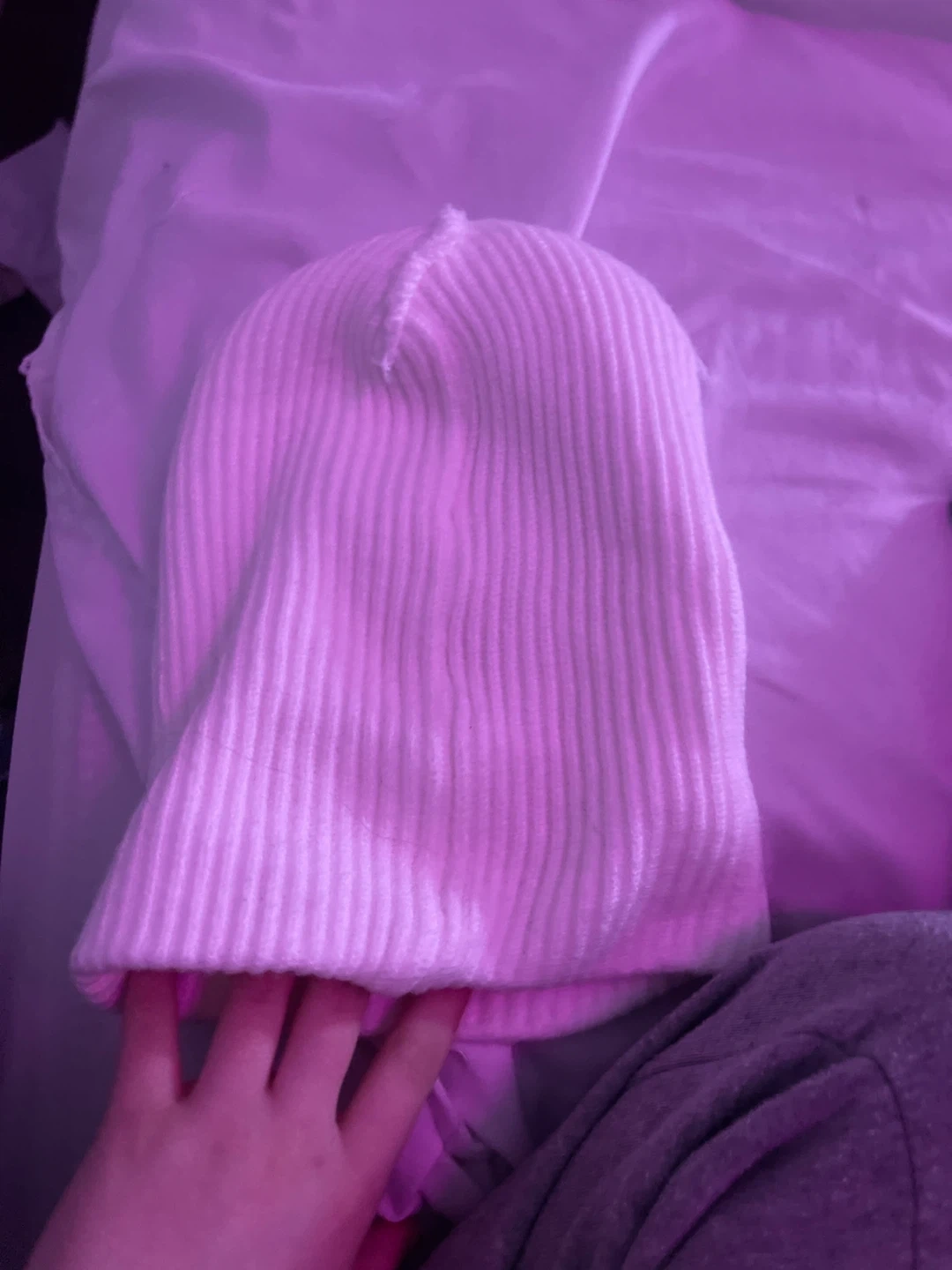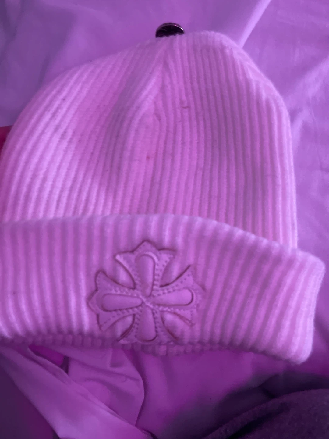 White ribbed beanie. Features a faux leather cross emblem on the cuff. Knit material. It was some spots can come out in wash