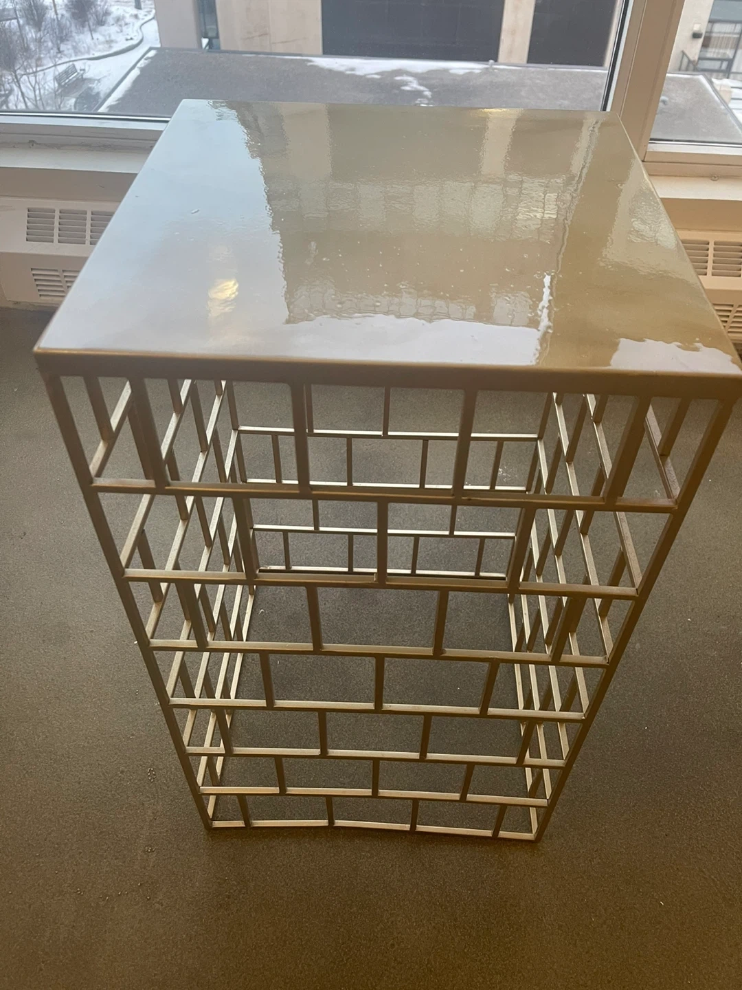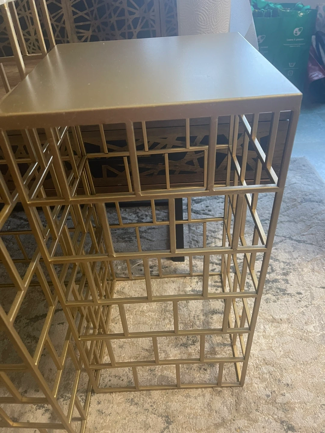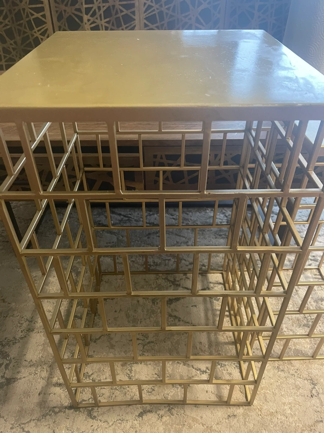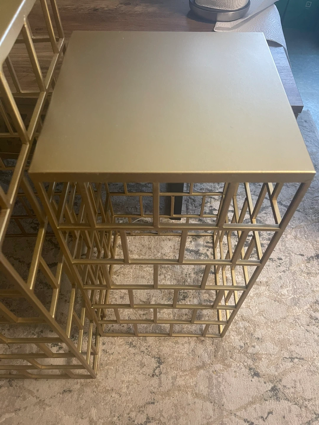 A set of two nesting accent side tables with a gold metal frame. They have geometric cage design on the bases. These tables can be used together or separately. They are in excellent condition .