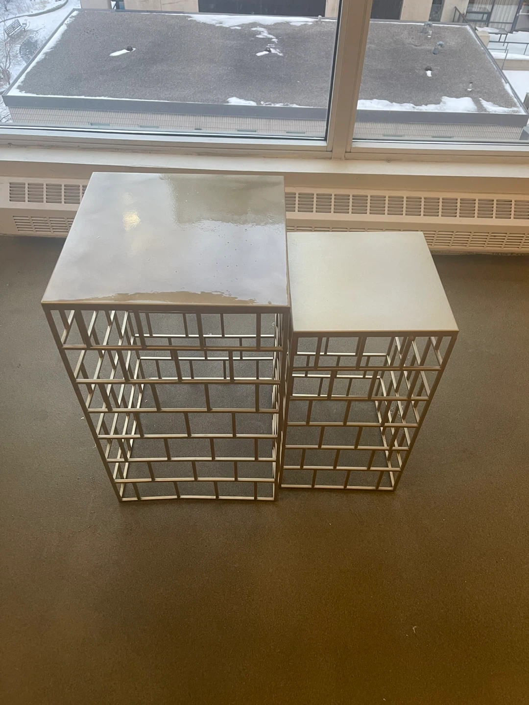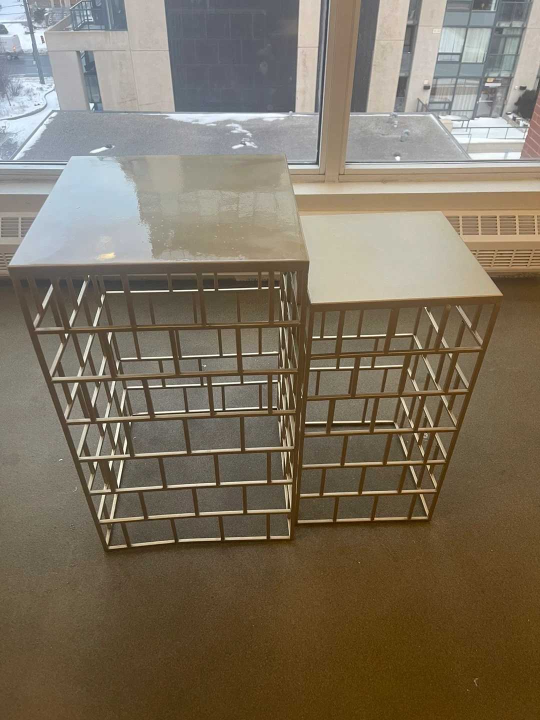 A set of two nesting accent side tables with a gold metal frame. They have geometric cage design on the bases. These tables can be used together or separately. They are in excellent condition .