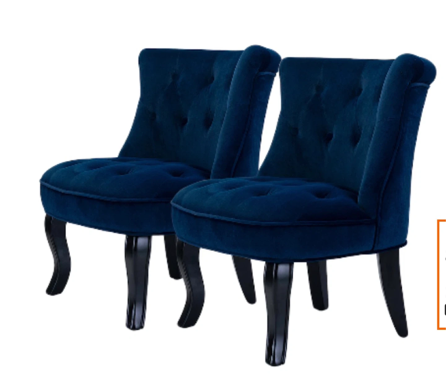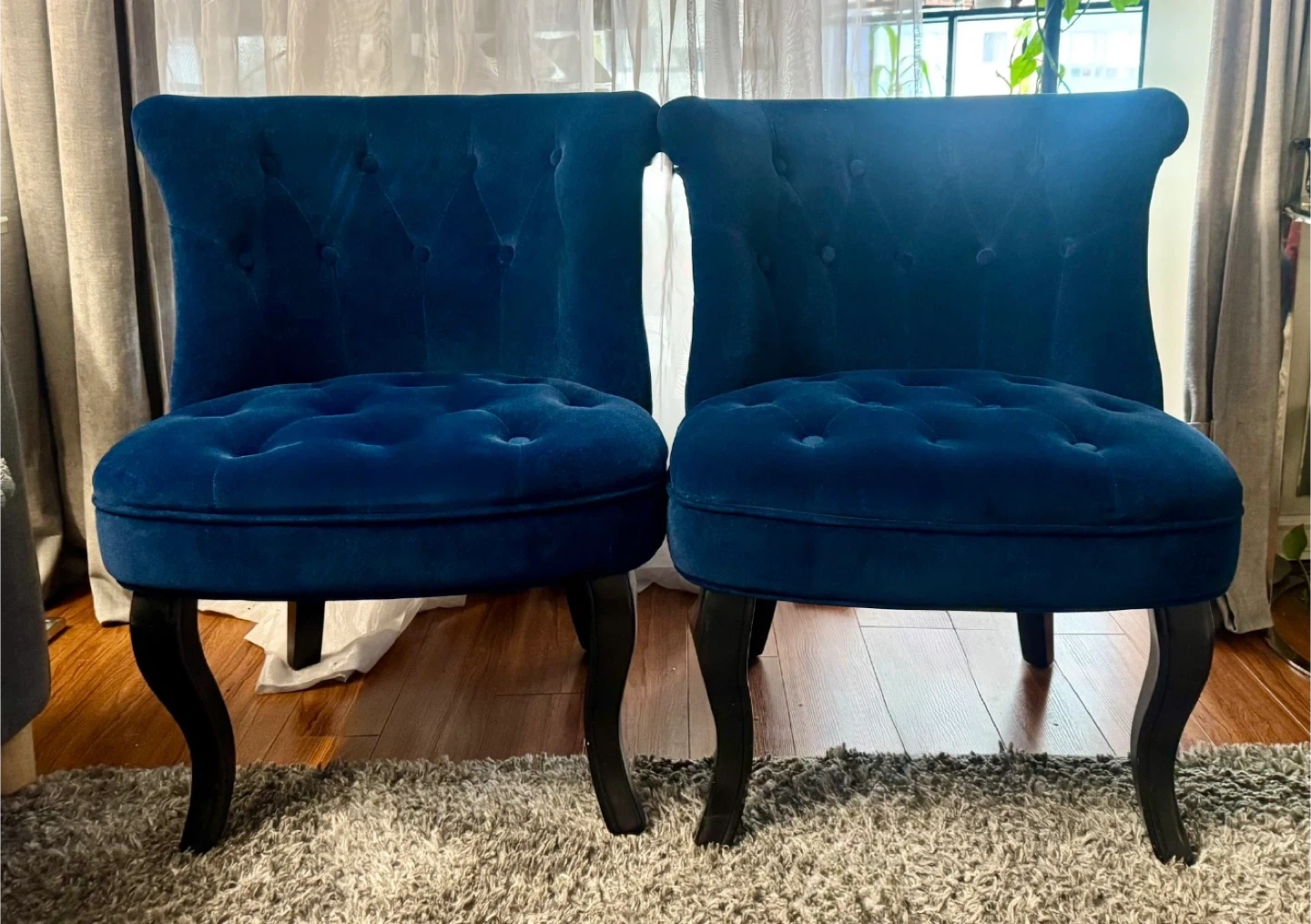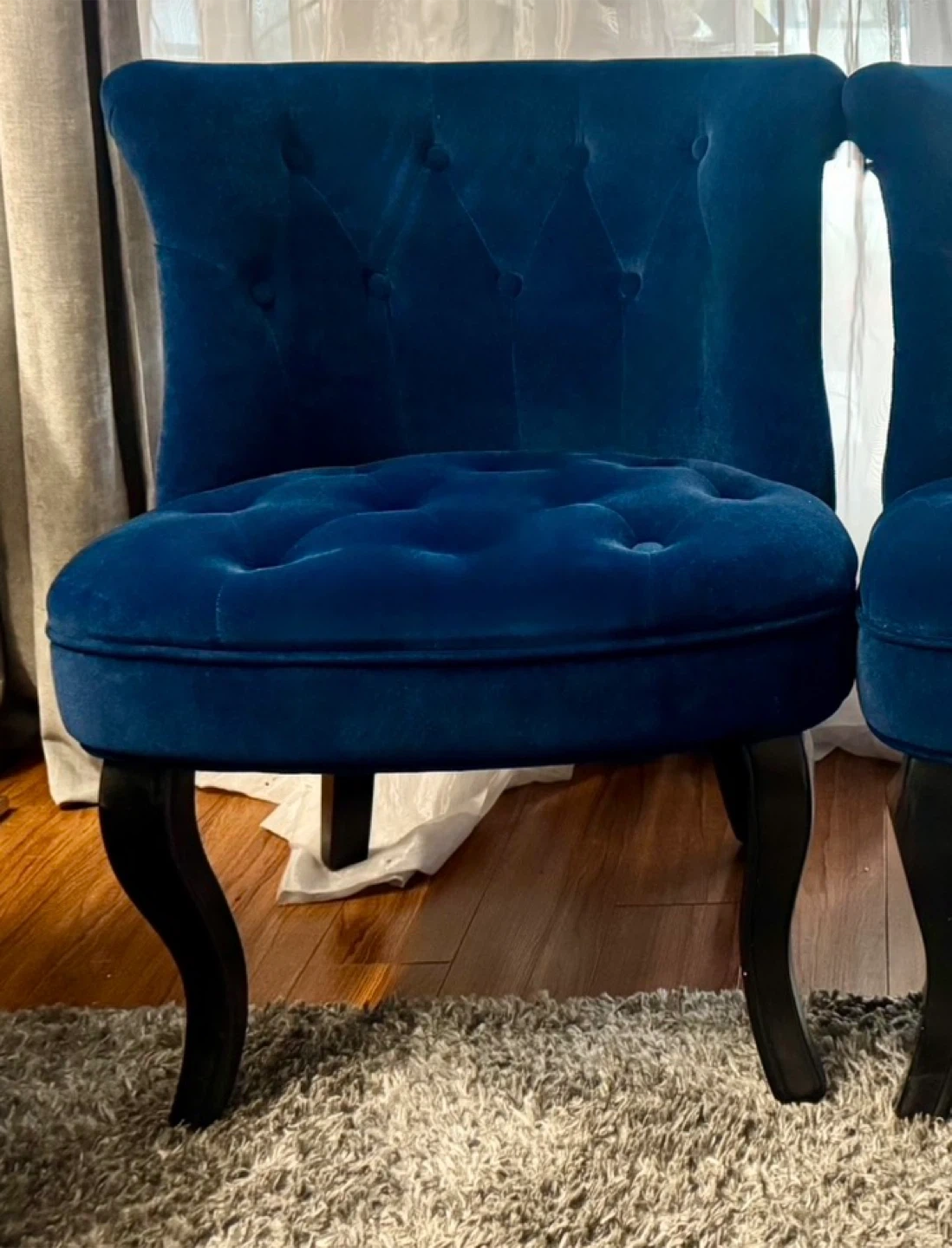 Two charming blue velvet accent chairs with tufted backs and cushioned seats. These chairs feature dark, curved legs for a touch of elegance. Upholstered in soft velvet, they're perfect for adding a stylish seating option to any room. Velvet material.