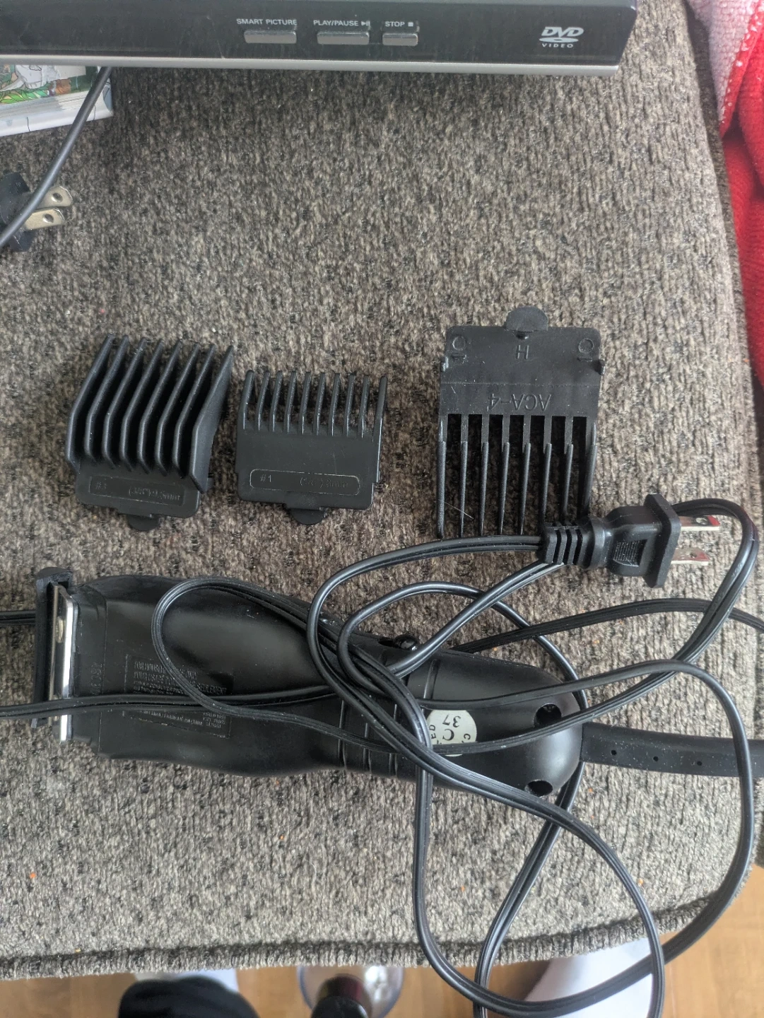 Black corded hair clippers with three attachment guards. Guards include sizes #1 (3mm), #2 (6mm), and #4 (13mm). Great for at-home haircuts!