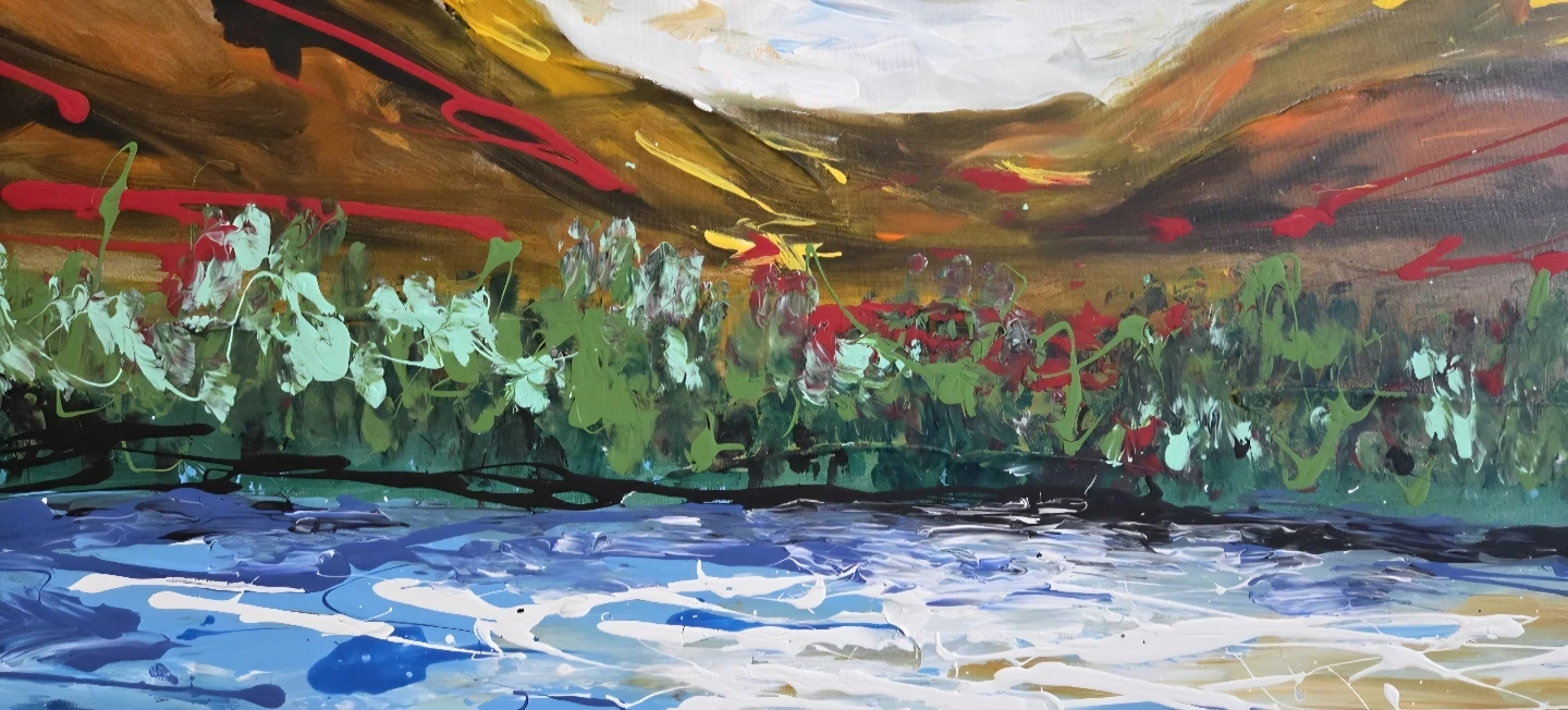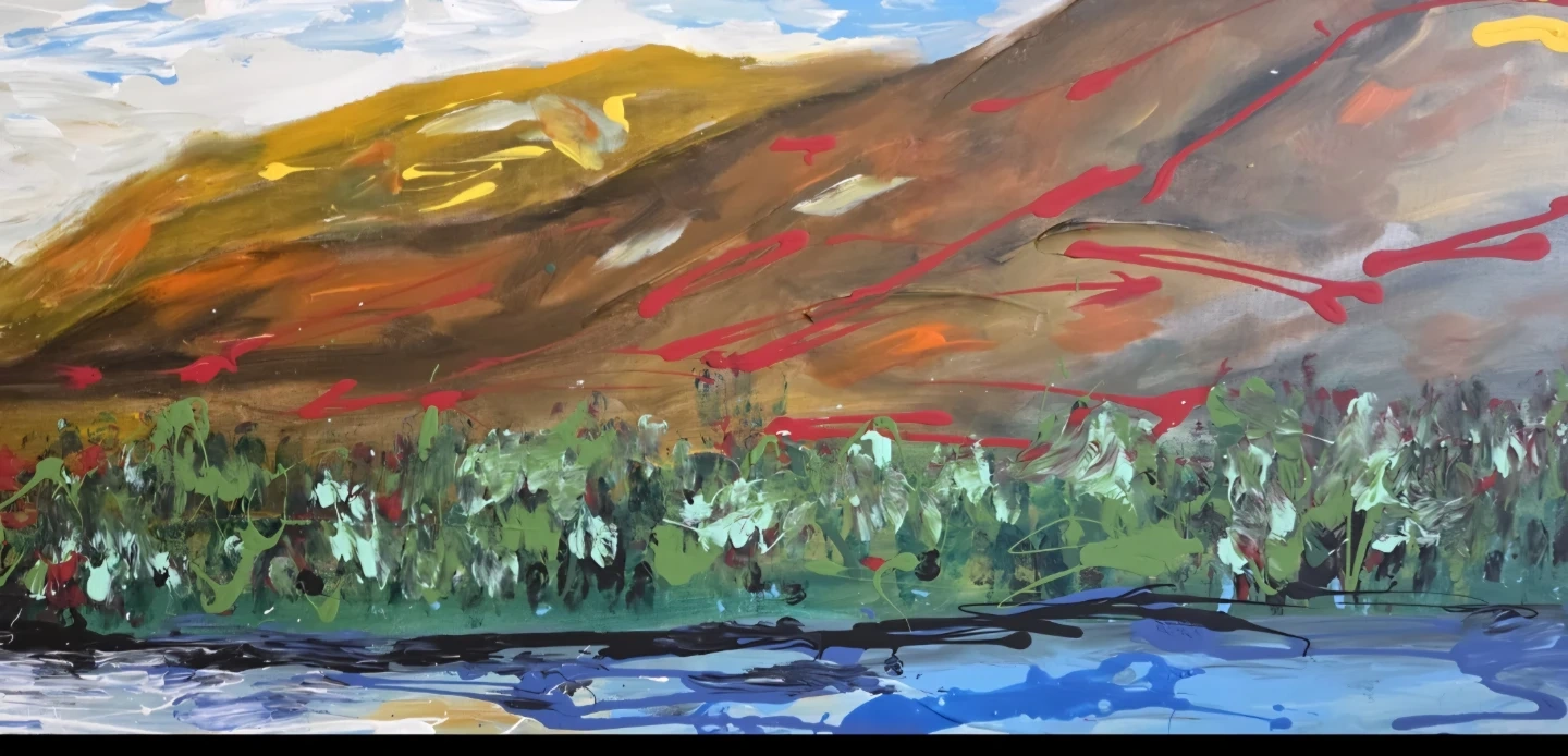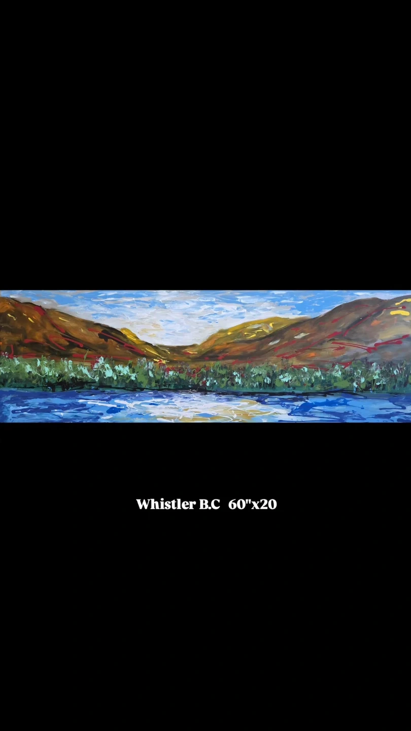 Huge original hand-painted painting by local artist Whistler B.C 60"x20 Acrylic on canvas with varnish protection Ready to hang to view more of my artwork go to my Instagram zkart2021 Custom order painting available Abstract modern cubist landscape cityscape flowers.