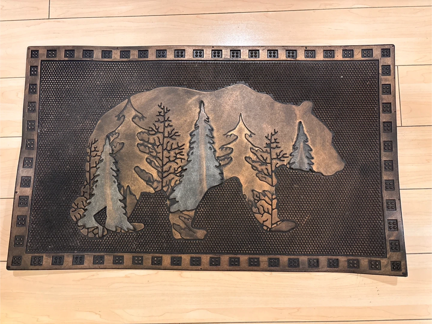 This doormat features a rustic bear silhouette filled with a pine forest scene. It has a textured surface for traction. A great way to greet guests with a touch of nature!