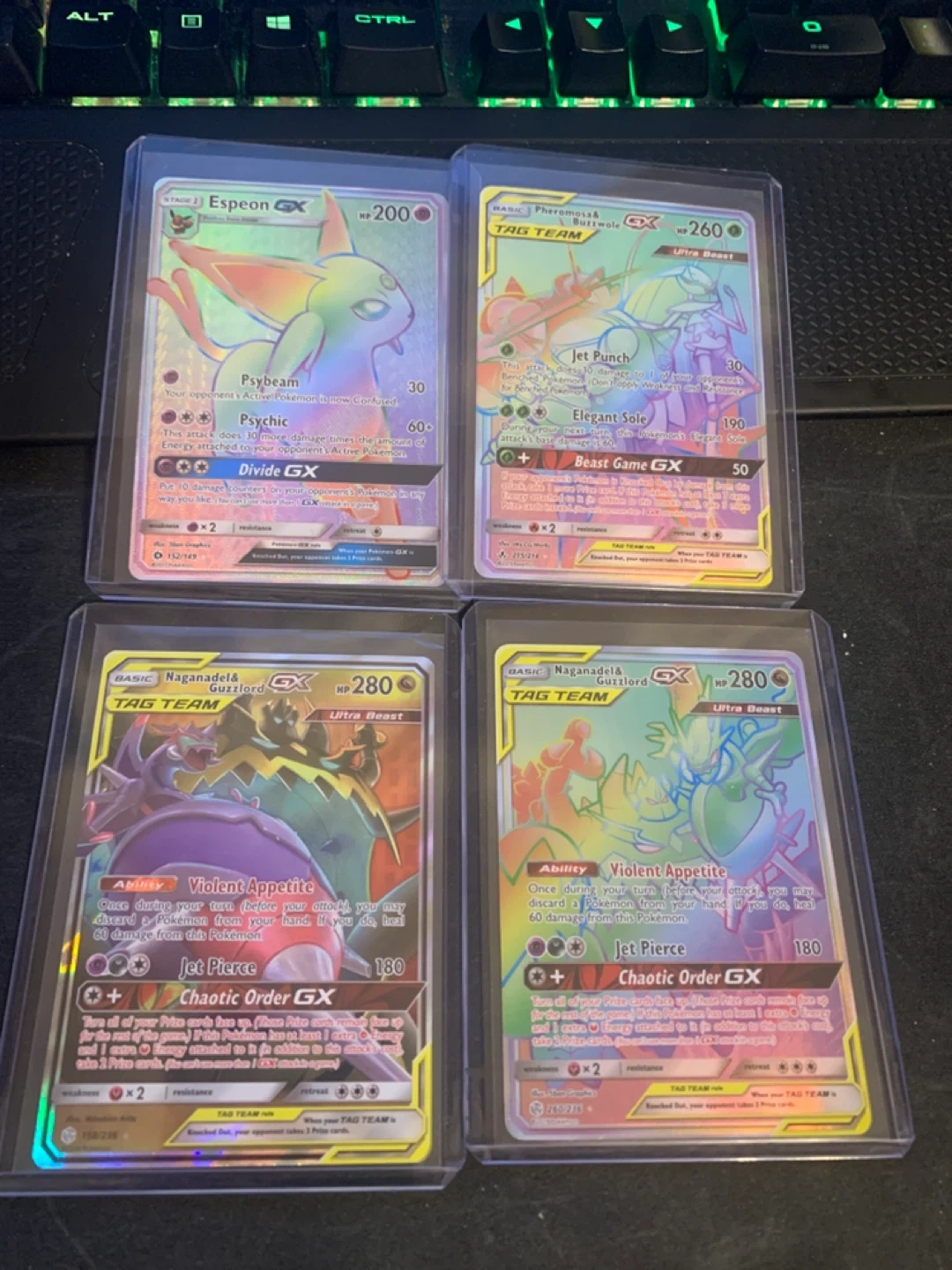 Four Pokémon TCG Tag Team cards included: Espeon GX, Pheromosa & Buzzwole GX, and two Naganadel & Guzzlord GX. These cards feature 'Ultra Beast' status and GX attacks.