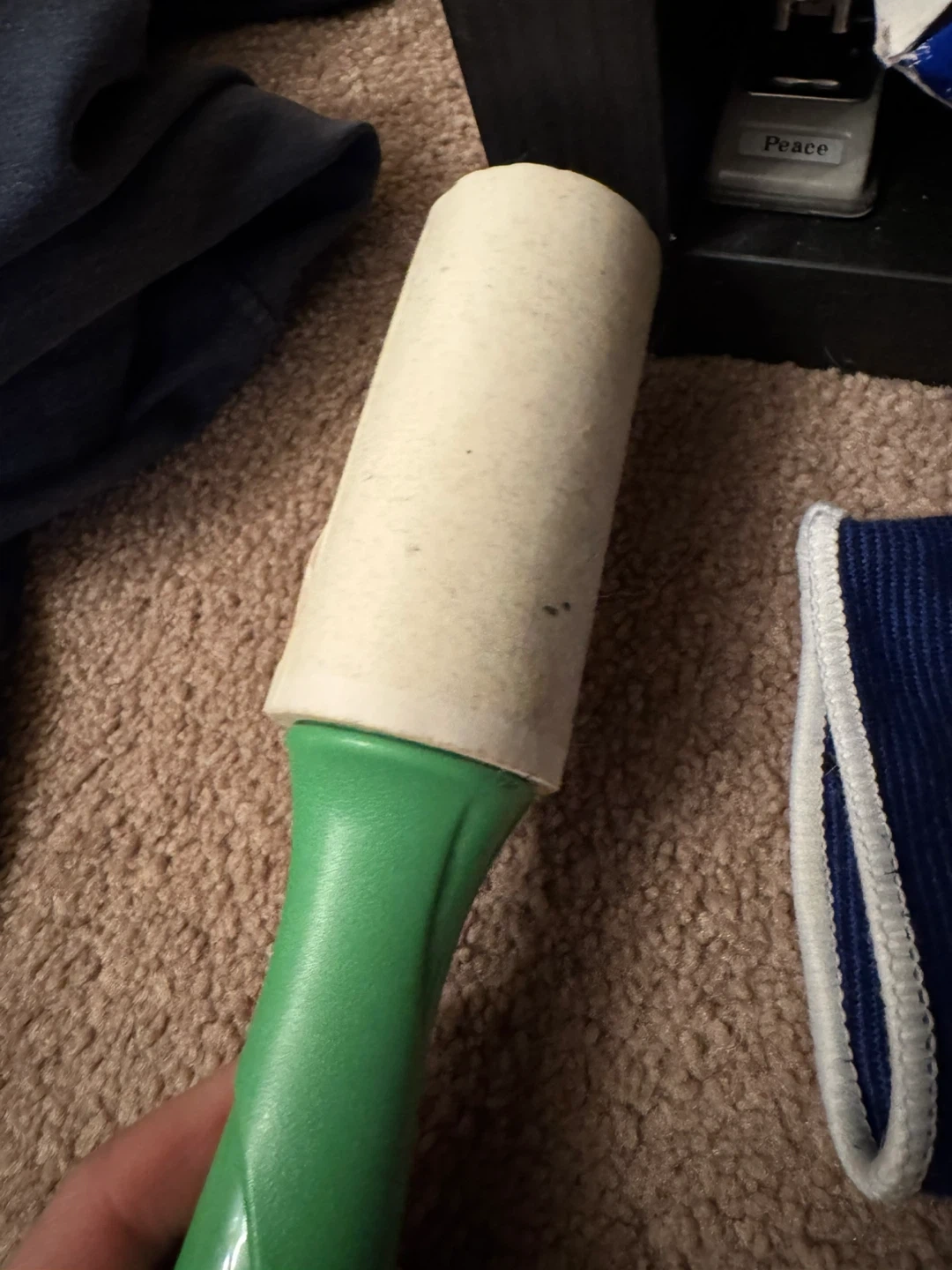This lint roller has a green plastic handle and a sticky roller for picking up lint and pet hair. It's great for quick touch-ups on clothing and upholstery. Easy to use for maintaining a tidy look!