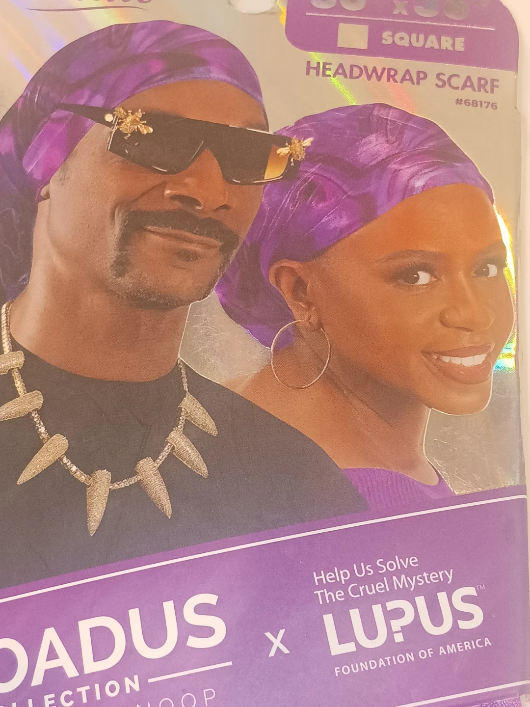 This is the Broadus Collection headwrap by Shante & Snoop. It's a shiny purple fabric. It's made in collaboration with the Lupus Foundation of America to help solve the cruel mystery.