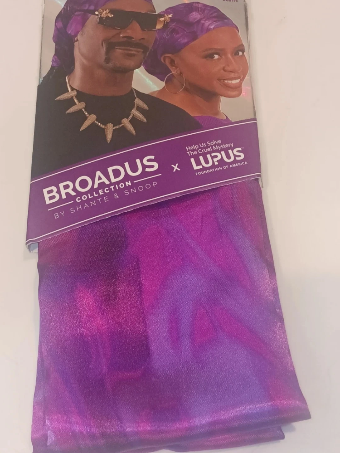This is the Broadus Collection headwrap by Shante & Snoop. It's a shiny purple fabric. It's made in collaboration with the Lupus Foundation of America to help solve the cruel mystery.