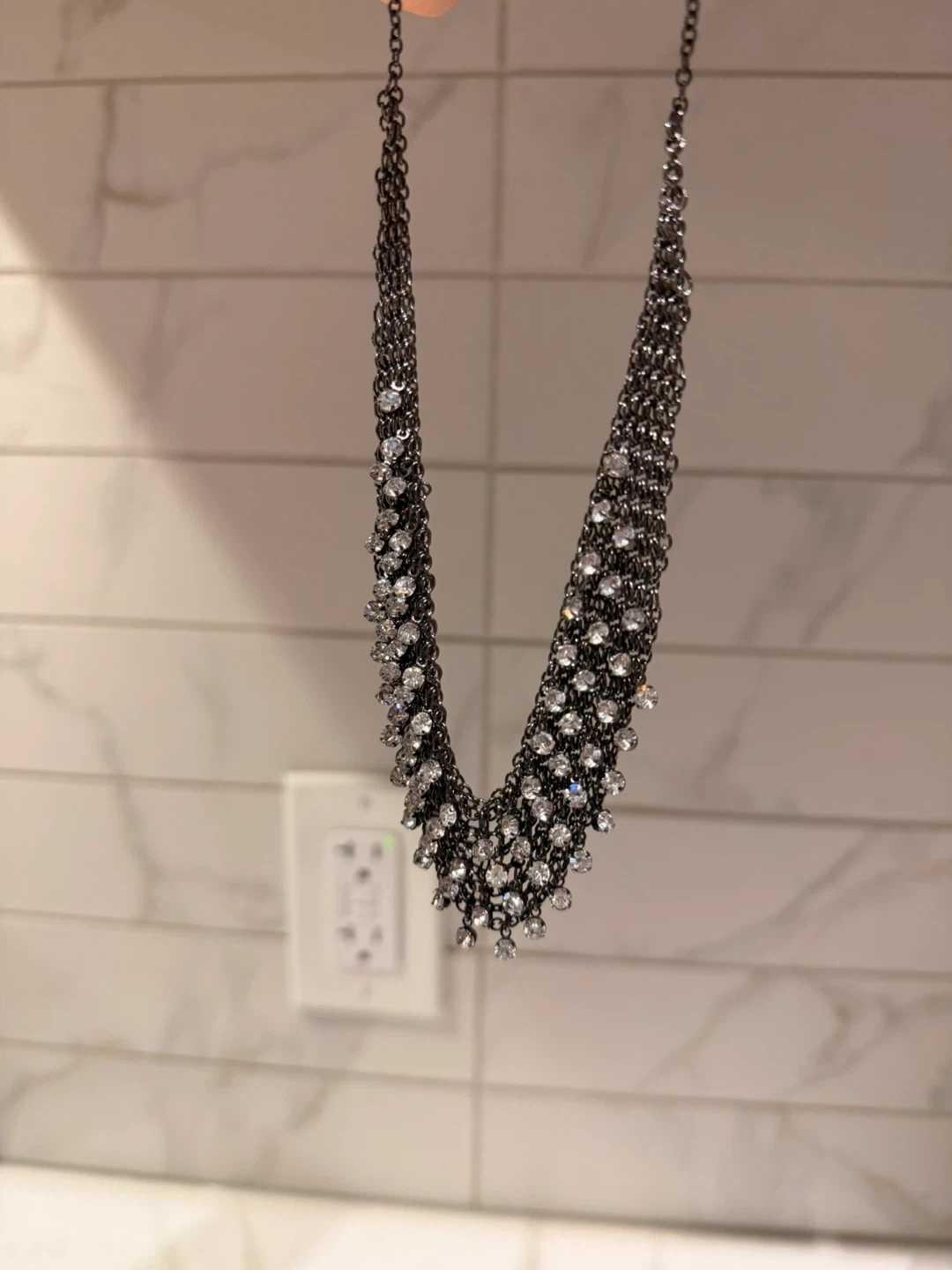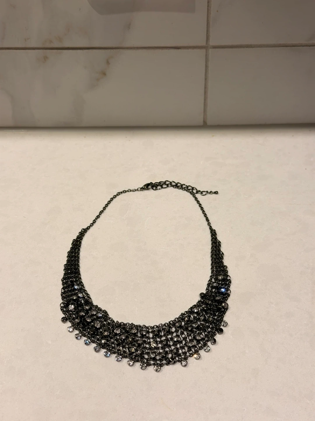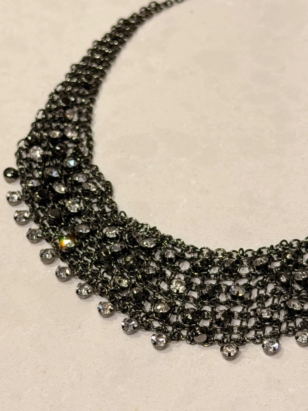 This choker necklace is made of a dark metal chain link material. It's adorned with many small, clear rhinestones that sparkle. It's designed to be worn close to the neck.