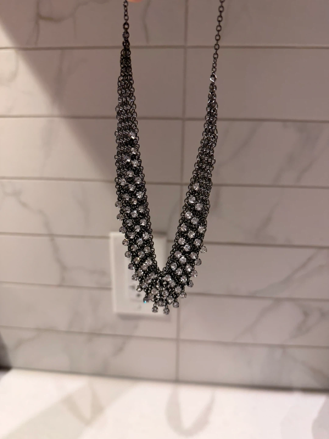 This choker necklace is made of a dark metal chain link material. It's adorned with many small, clear rhinestones that sparkle. It's designed to be worn close to the neck.