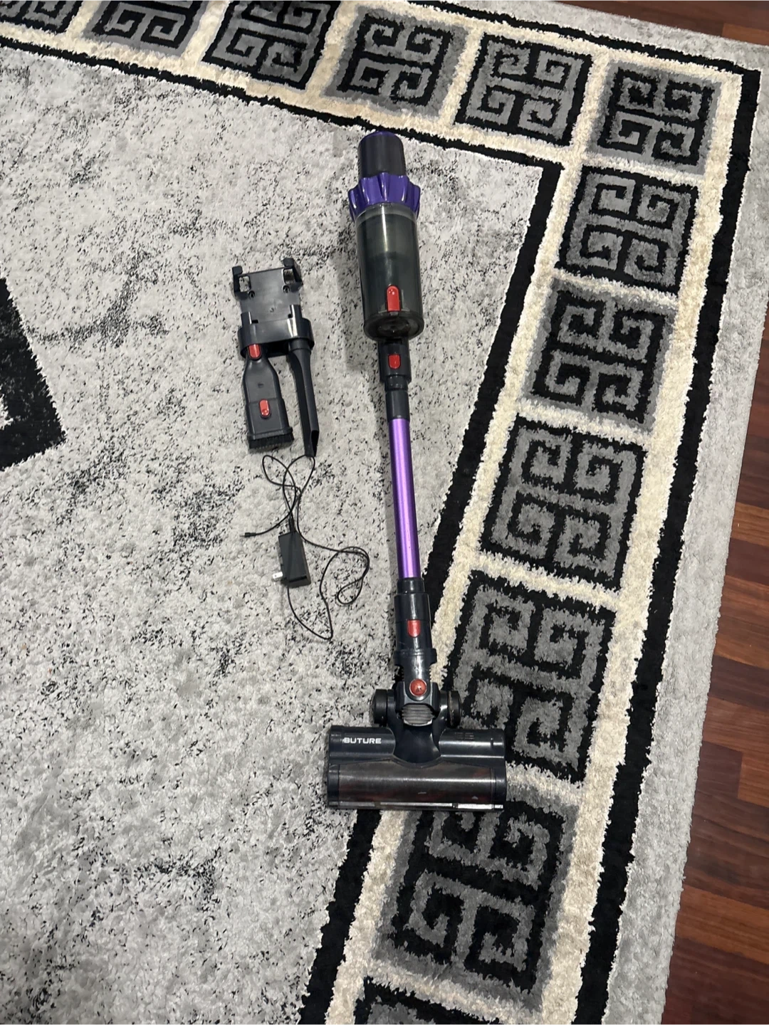 This is a BUTURE cordless stick vacuum cleaner. It's purple and black with a detachable handheld unit. Includes the charging adapter and wall mount.