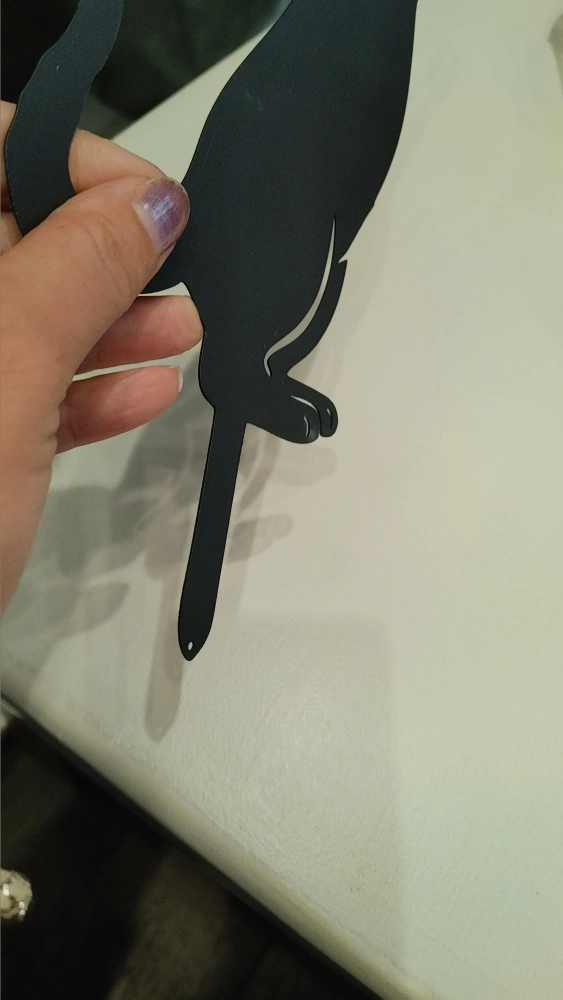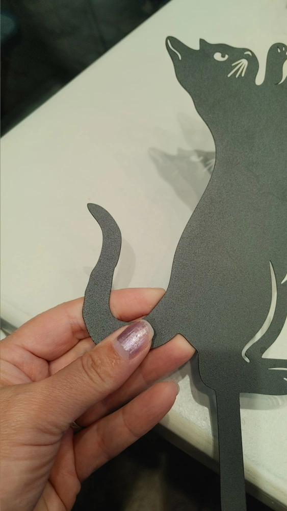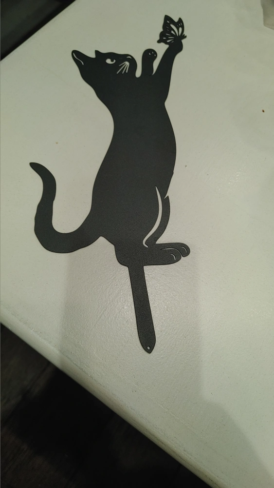 Black metal garden stake featuring a playful cat reaching for a butterfly. It's made of durable metal and includes a stake for easy placement in your garden. This piece adds a charming touch to any outdoor space!
