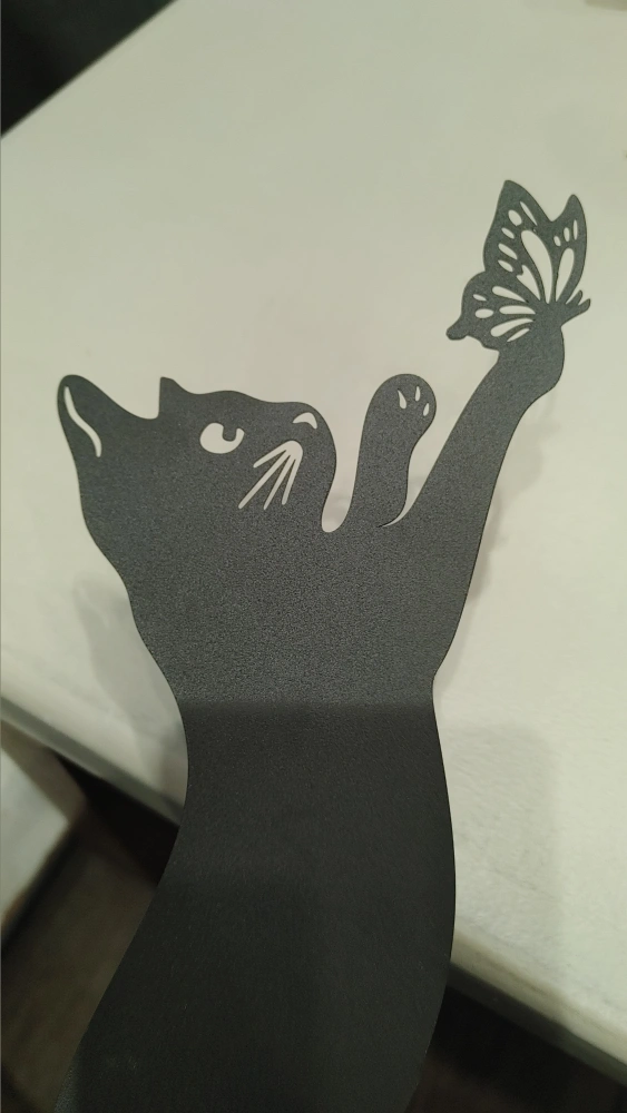 Black metal garden stake featuring a playful cat reaching for a butterfly. It's made of durable metal and includes a stake for easy placement in your garden. This piece adds a charming touch to any outdoor space!