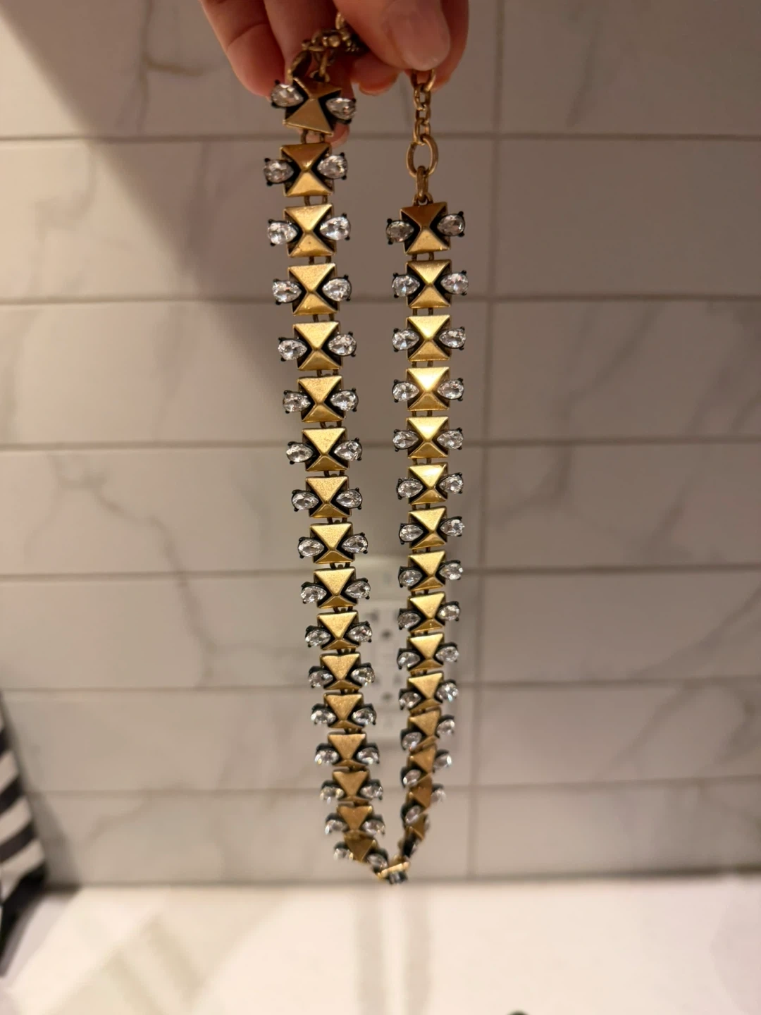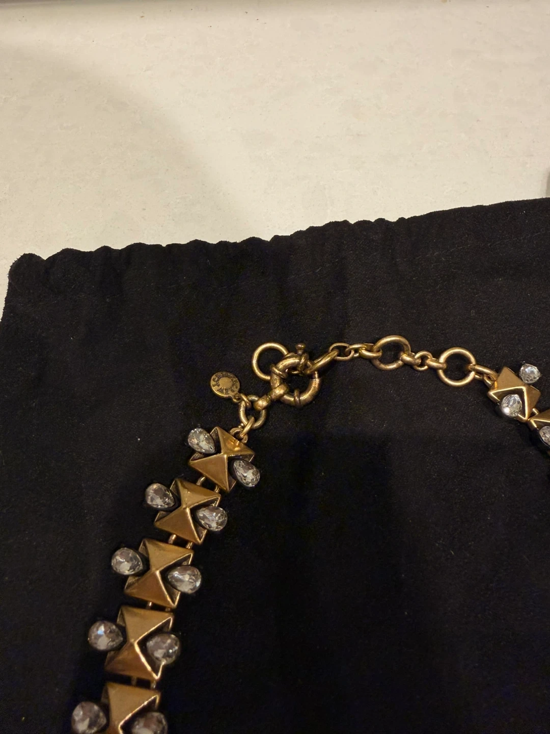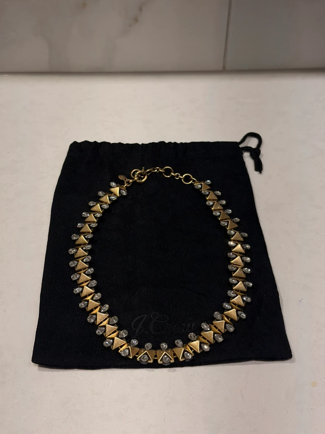 This J. Crew necklace features a gold tone finish with pyramid-shaped accents and clear crystals. It comes with a drawstring pouch for storage. It's a statement piece that adds sparkle to any outfit!