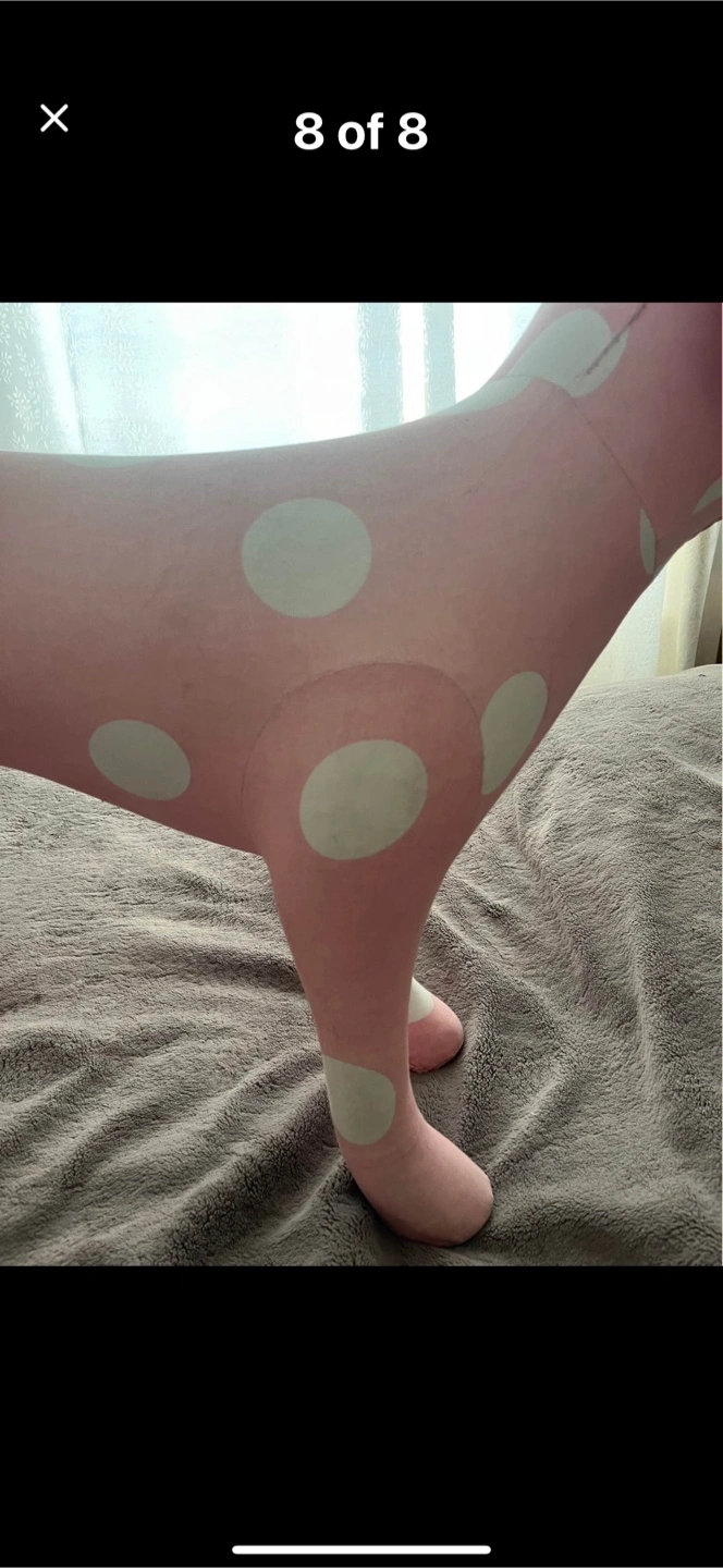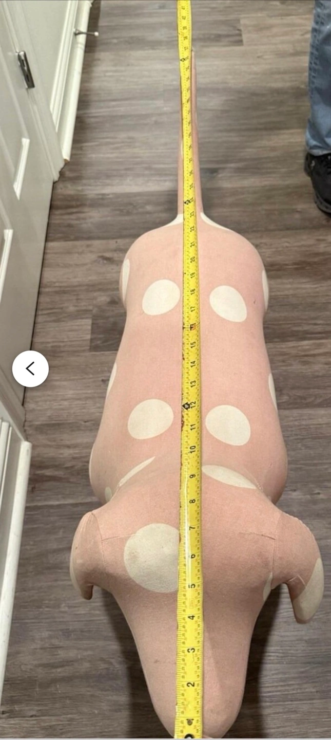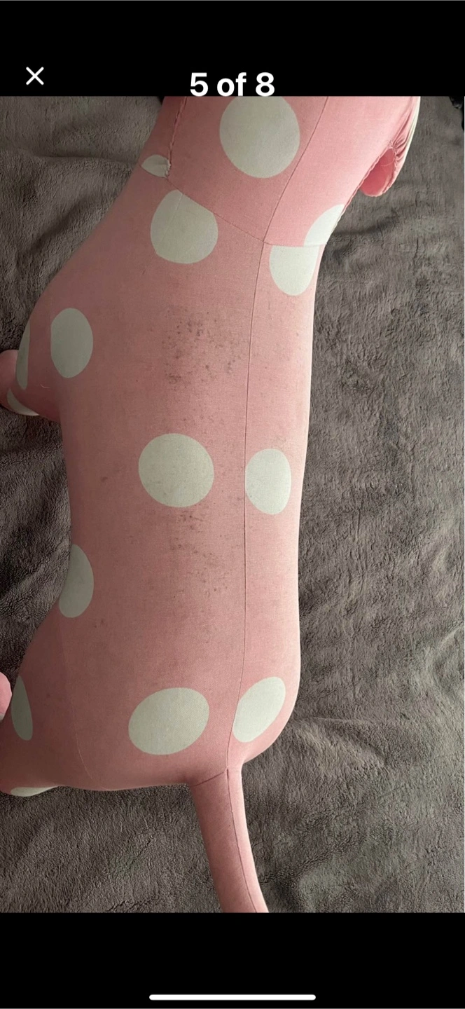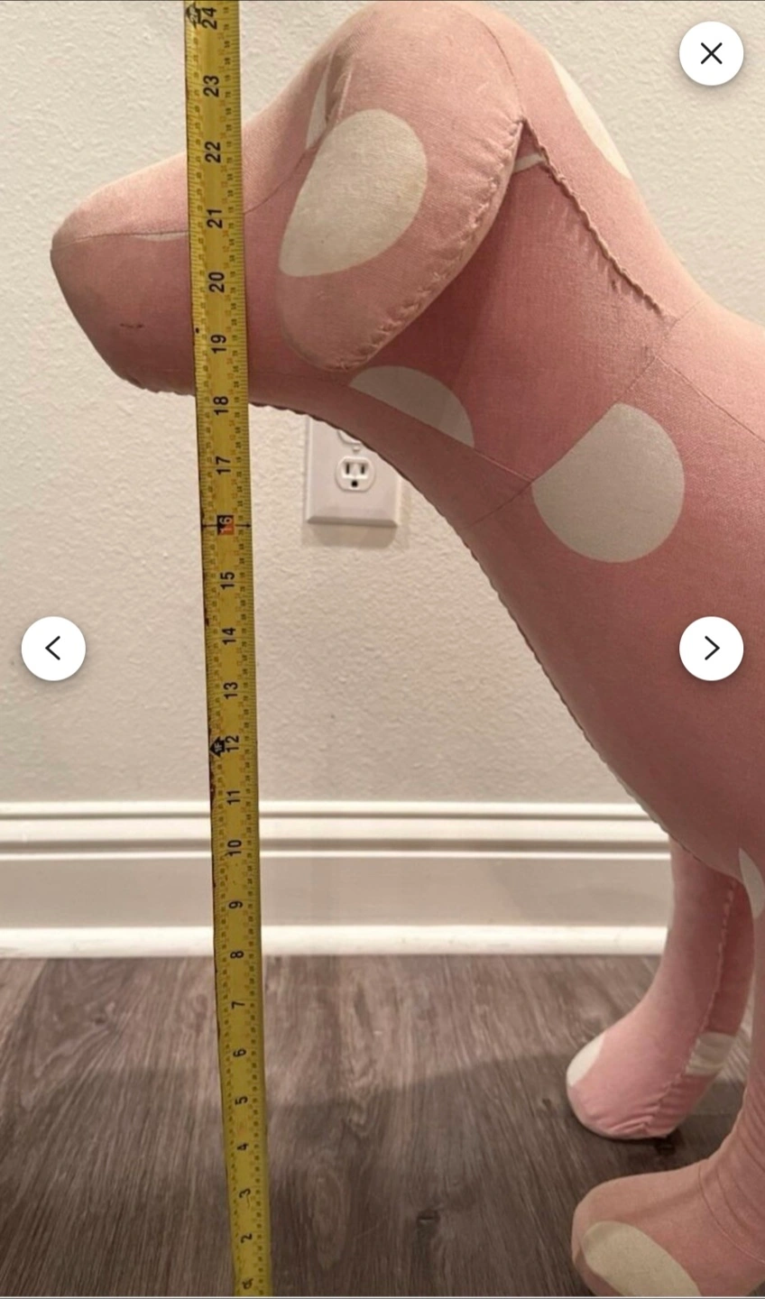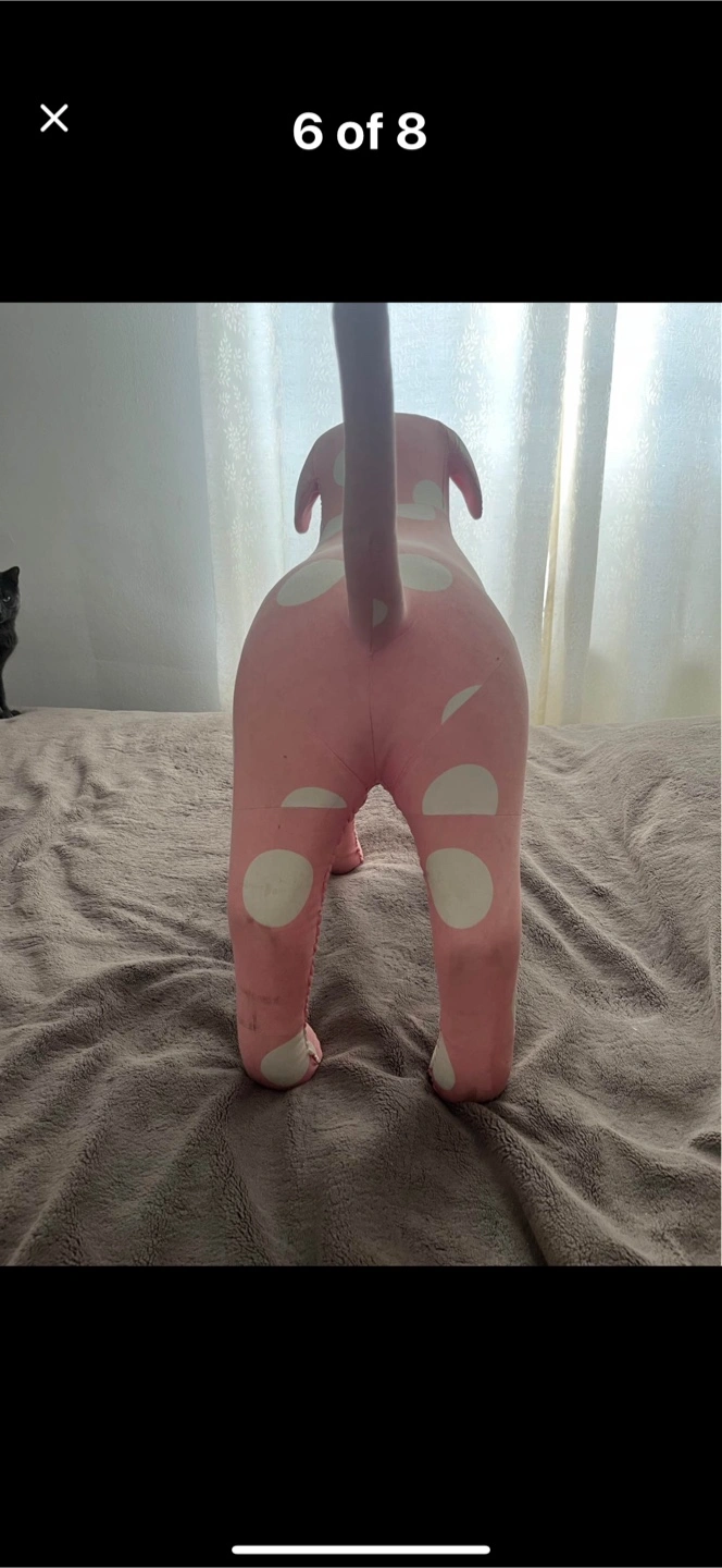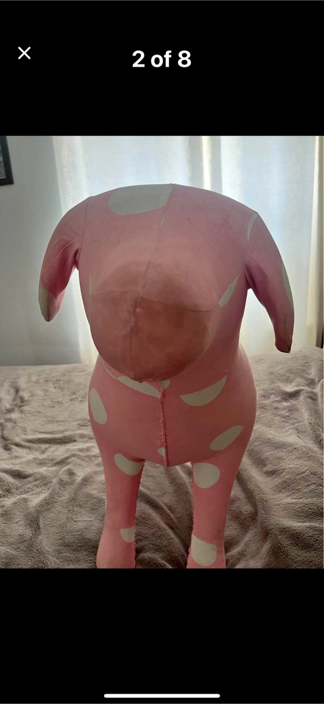 Cute pink plush dog with white polka dots. It's a fun decorative item. Some minor scuffs visible on the fabric.