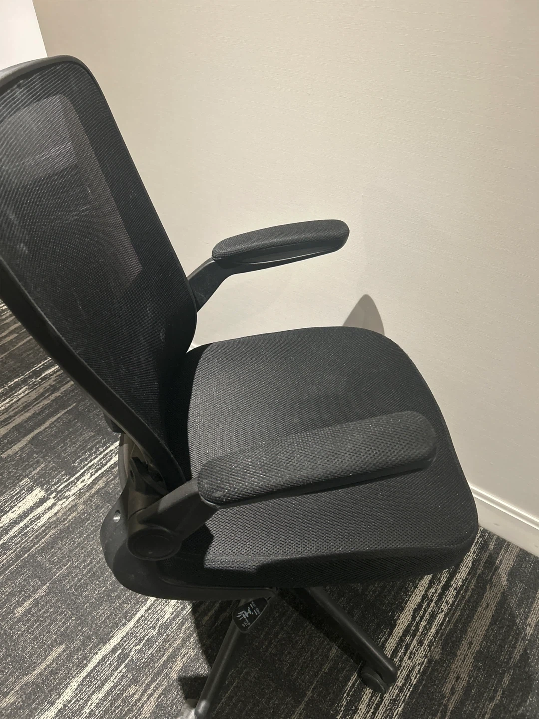 This is a black mesh office chair. It features adjustable armrests and a padded seat. The chair has a sturdy base with wheels for easy mobility.