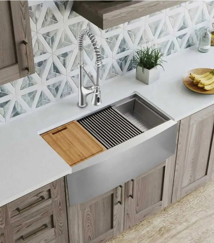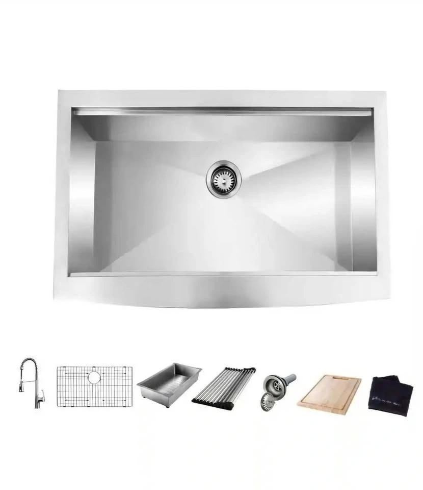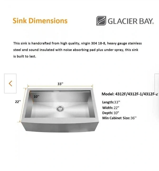 Brand new Glacier Bay Farmhouse Apron Front Stainless Steel 33 in. Single Bowl Kitchen Sink with Accessories. Made from high-quality, virgin 304 18-8, heavy gauge stainless steel and sound insulated with noise absorbing pad plus under spray, this sink is built to last. Sink dimensions are 33" in length, 22" in width and 10" in depth. Minimum Cabinet Size: 36". Crafted from high-quality, virgin 304 18-8, heavy gauge stainless steel. Sound insulated with noise-absorbing pad plus under spray. 3.5 in. drain opening.
