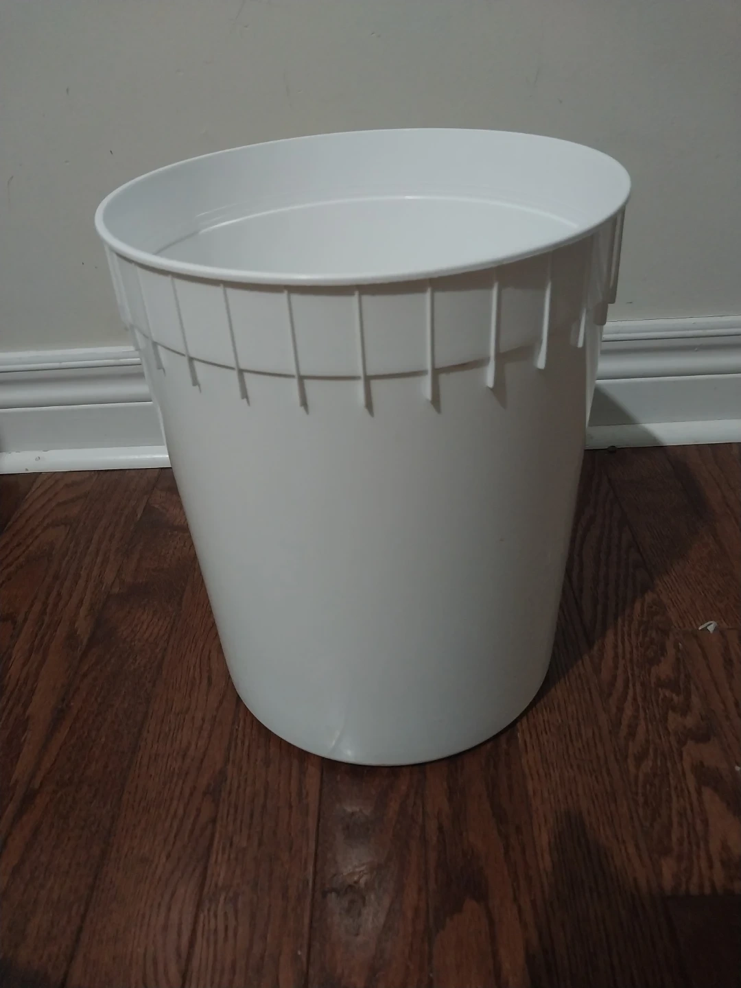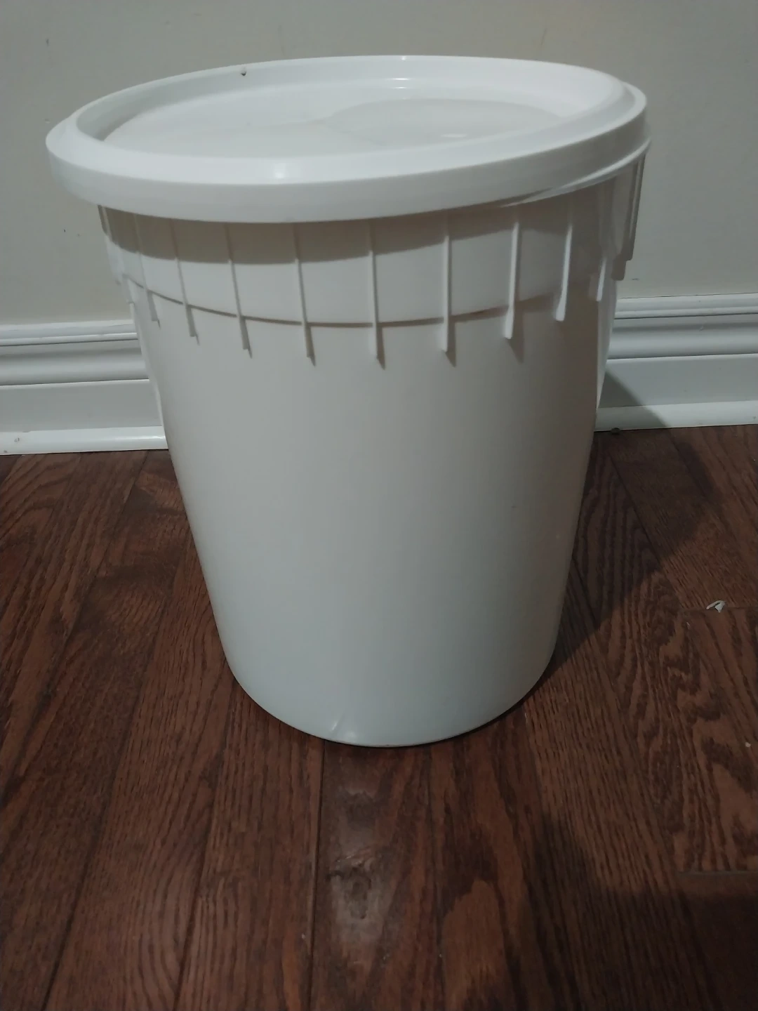 White plastic bucket with a lid. It's made of durable plastic and includes its original lid. This bucket is great for storage or general use.
