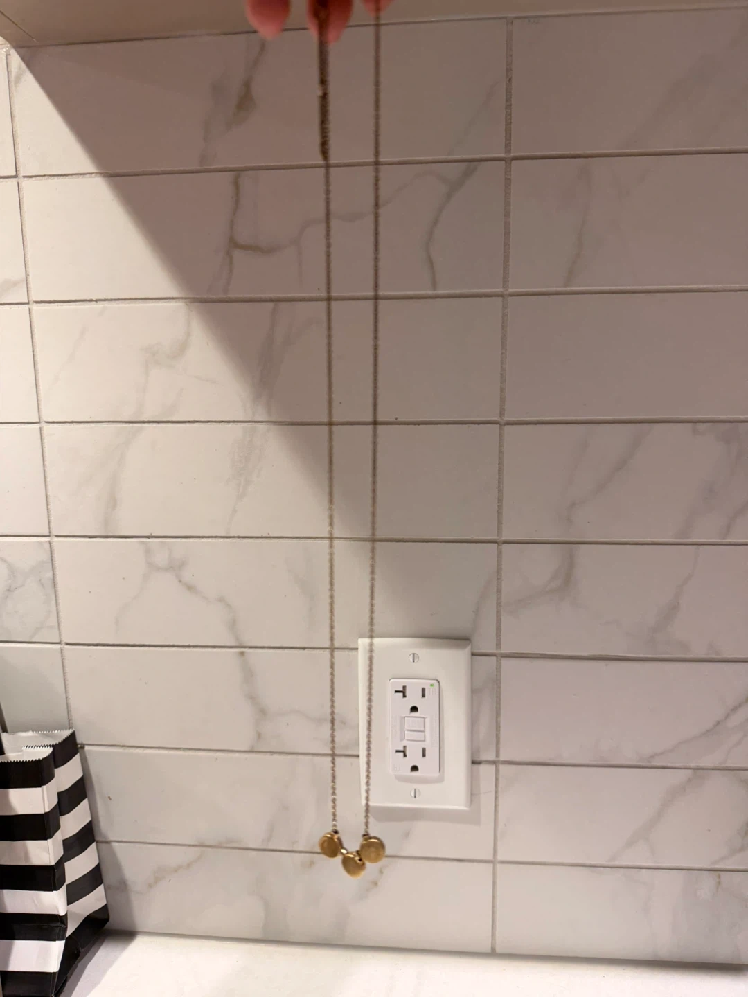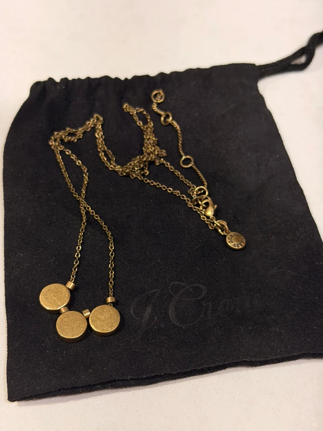 This J. Crew necklace features a delicate gold-tone chain with three round pendant charms. It includes a drawstring pouch for storage. It's a versatile accessory for everyday wear.