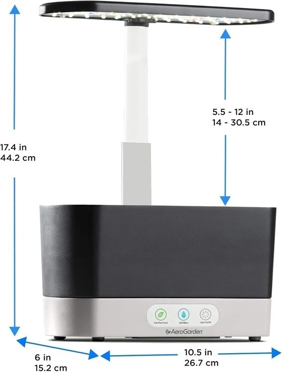 Includes Gourmet Herb Seed Kit (6-pod) with Genovese Basil, Curly Parsley, Dill, Thyme, Thai Basil, and Mint, plus a 3oz bottle of plant nutrients for a full season. Grow up to 6 plants at a time, up to 12" tall. Grows in water, no soil, no mess. Easy-to-use control panel reminds you when to add water and plant food. Features high-performance, full-spectrum 20-watt LED grow lights for rapid, natural growth. Enjoy fresh herbs and veggies year-round with this indoor garden system.