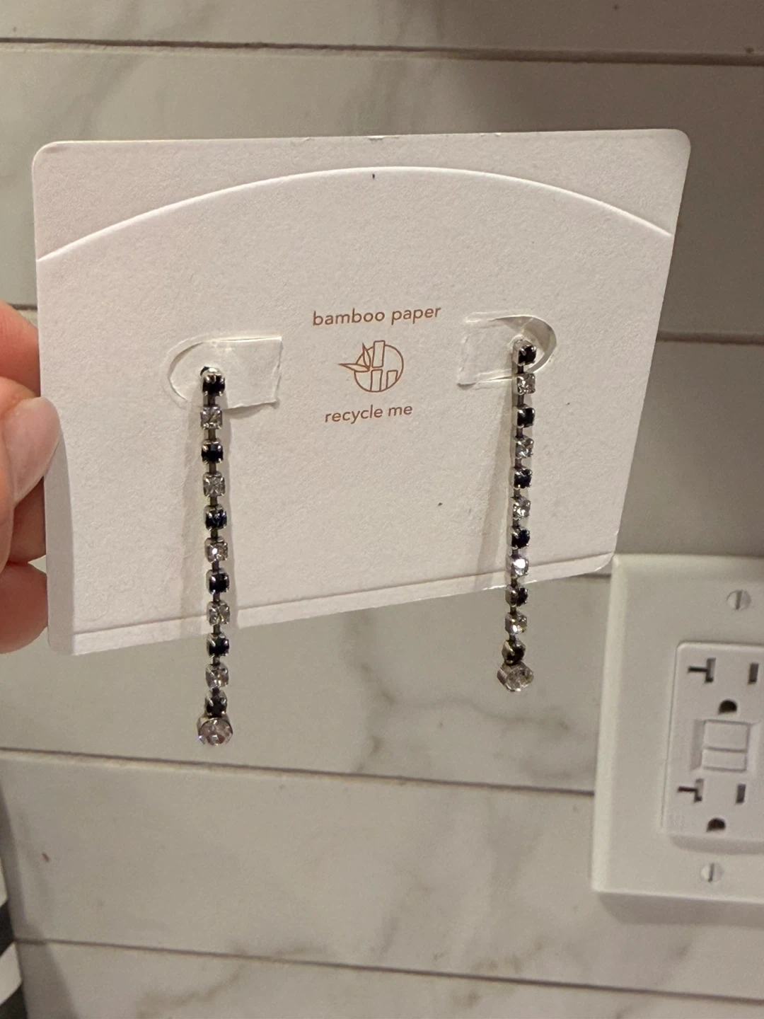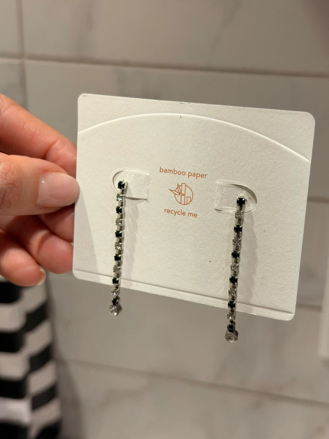 These dangle earrings feature a silver-tone chain with black and clear rhinestones.