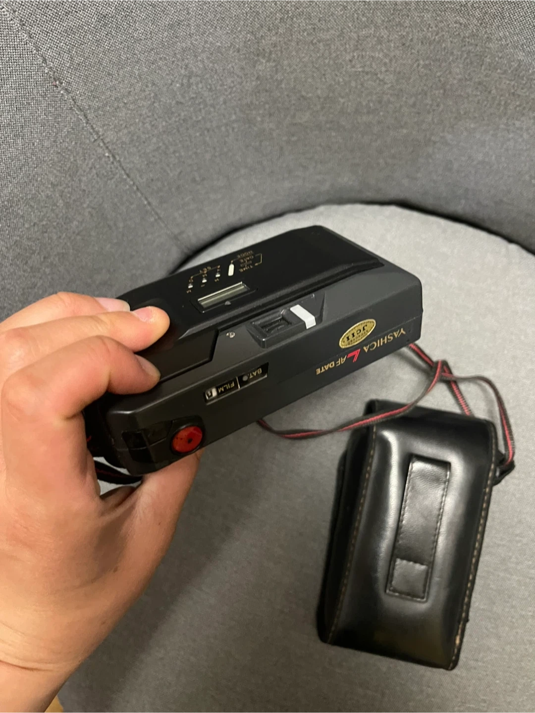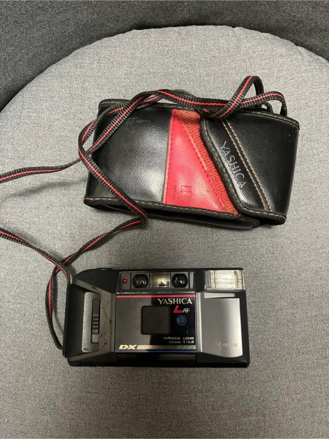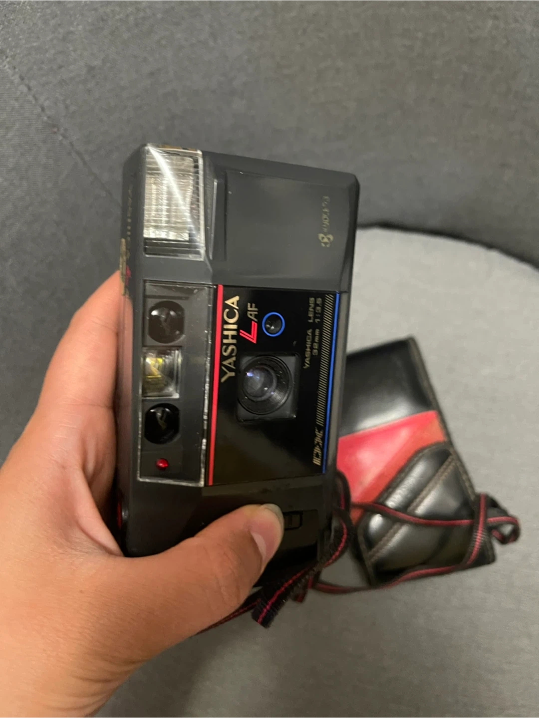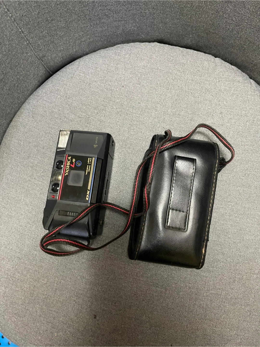 This is a Yashica film camera. It comes with a black and red Yashica leather case.