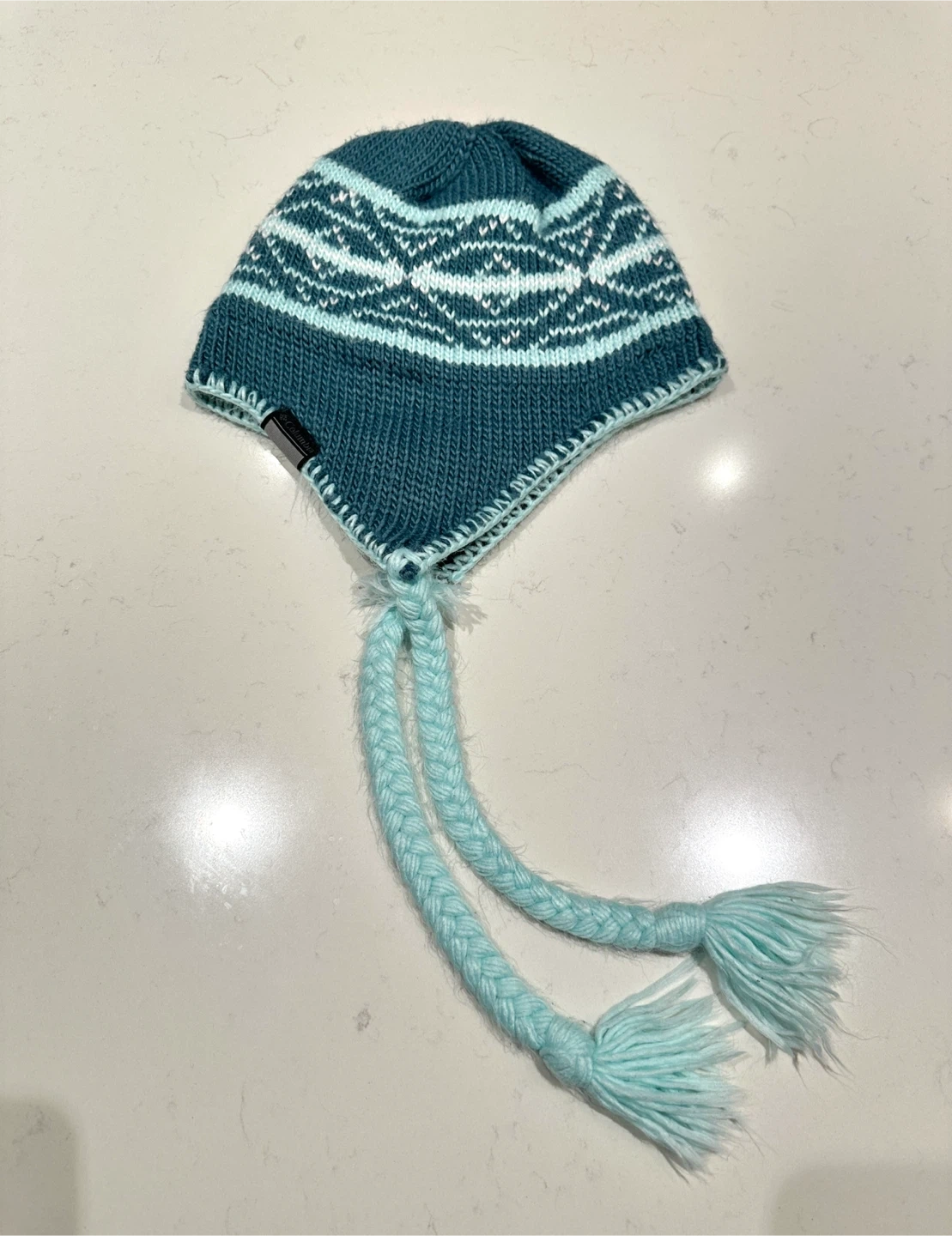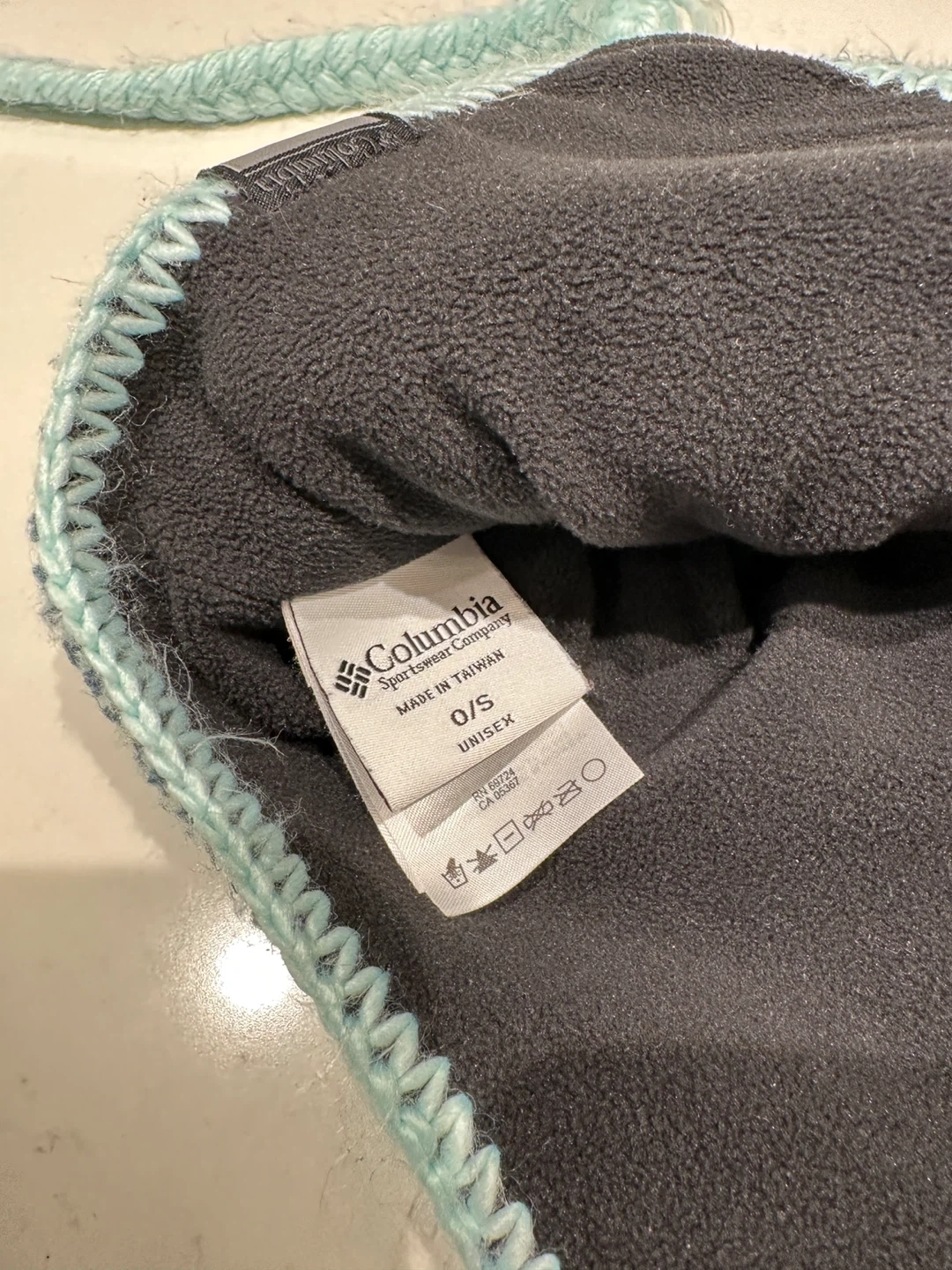 Columbia Sportswear Company winter hat. It's a size O/S with a fleece lining. The outer shell is knit with ear flaps and tassels.