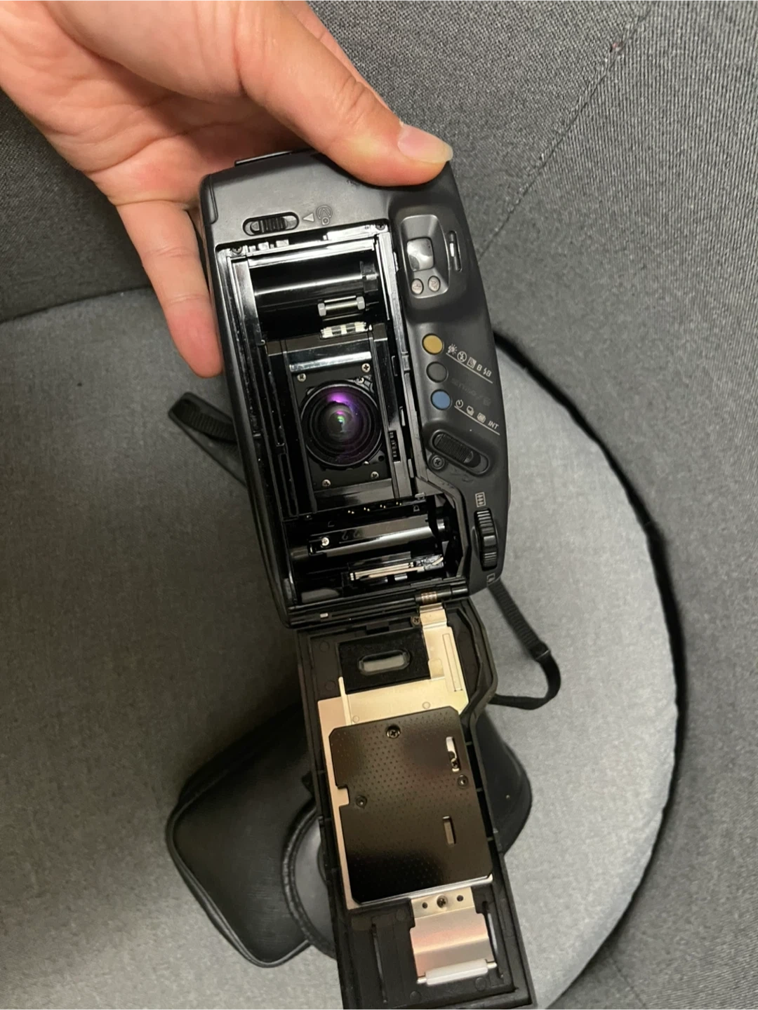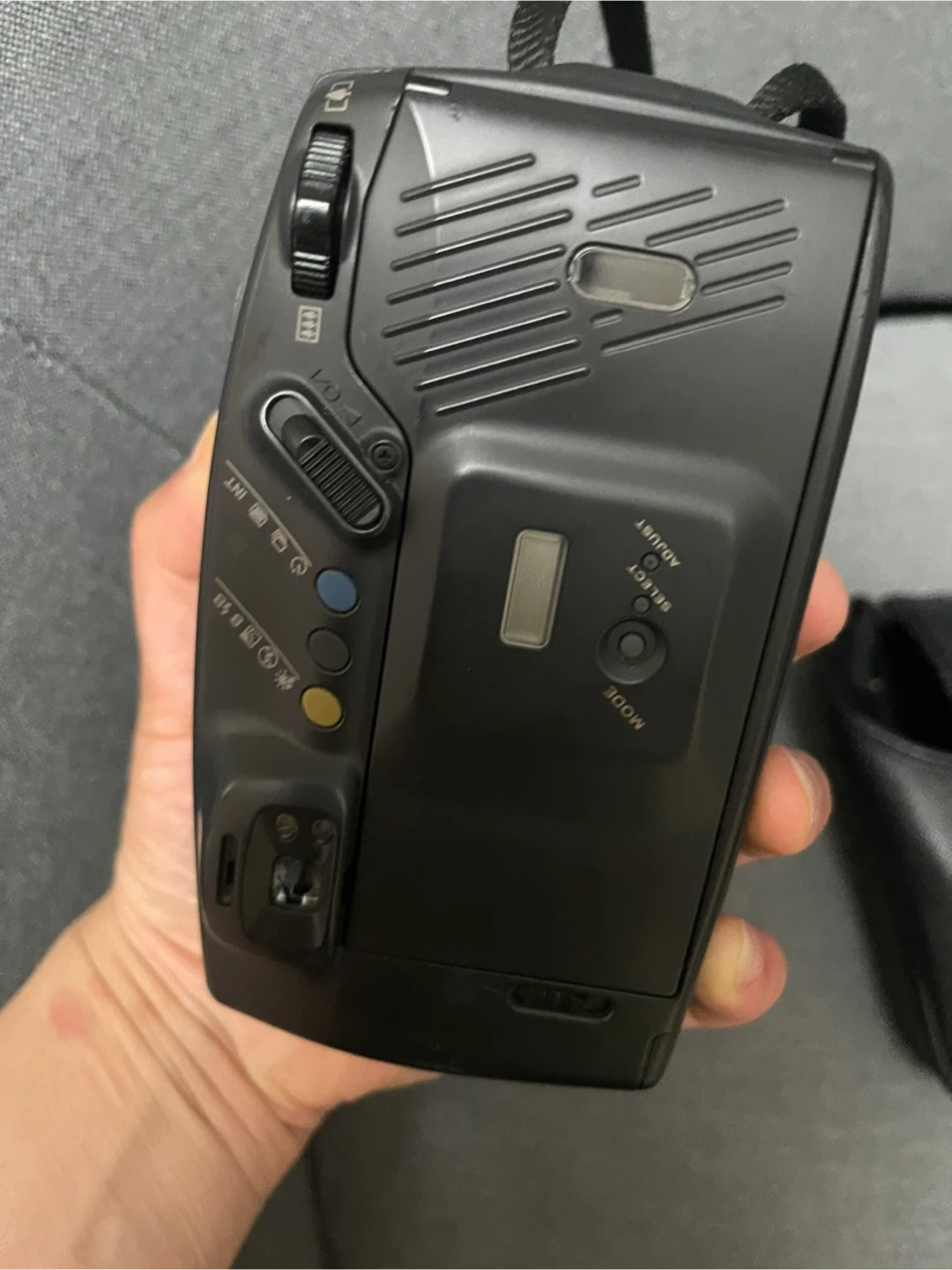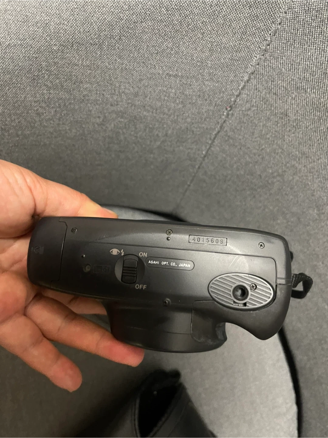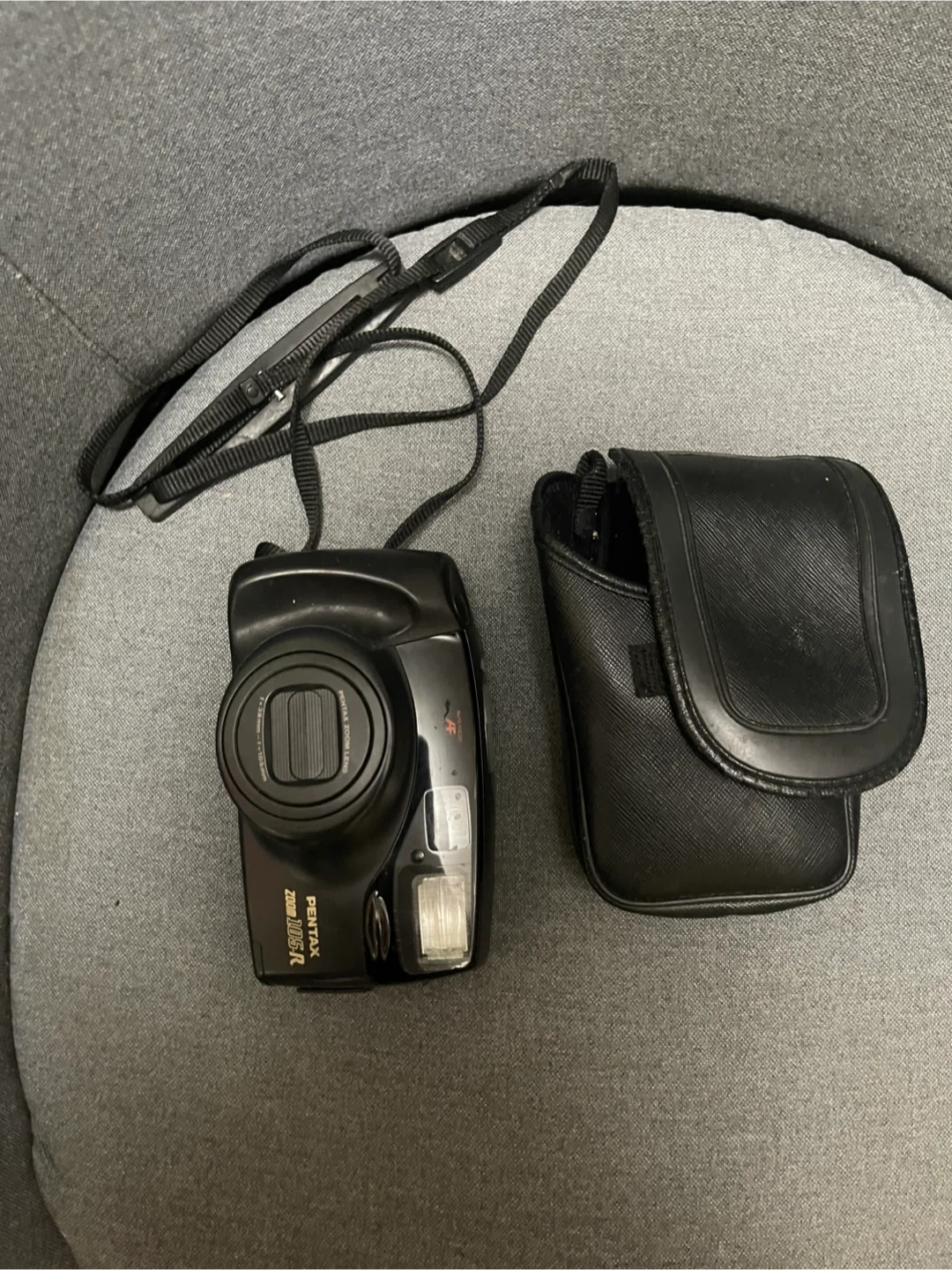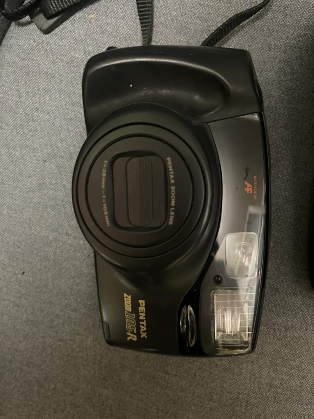 This is a Pentax Zoom 105-R 35mm film camera with a 38mm-105mm zoom lens. It comes with a black carrying case and strap.