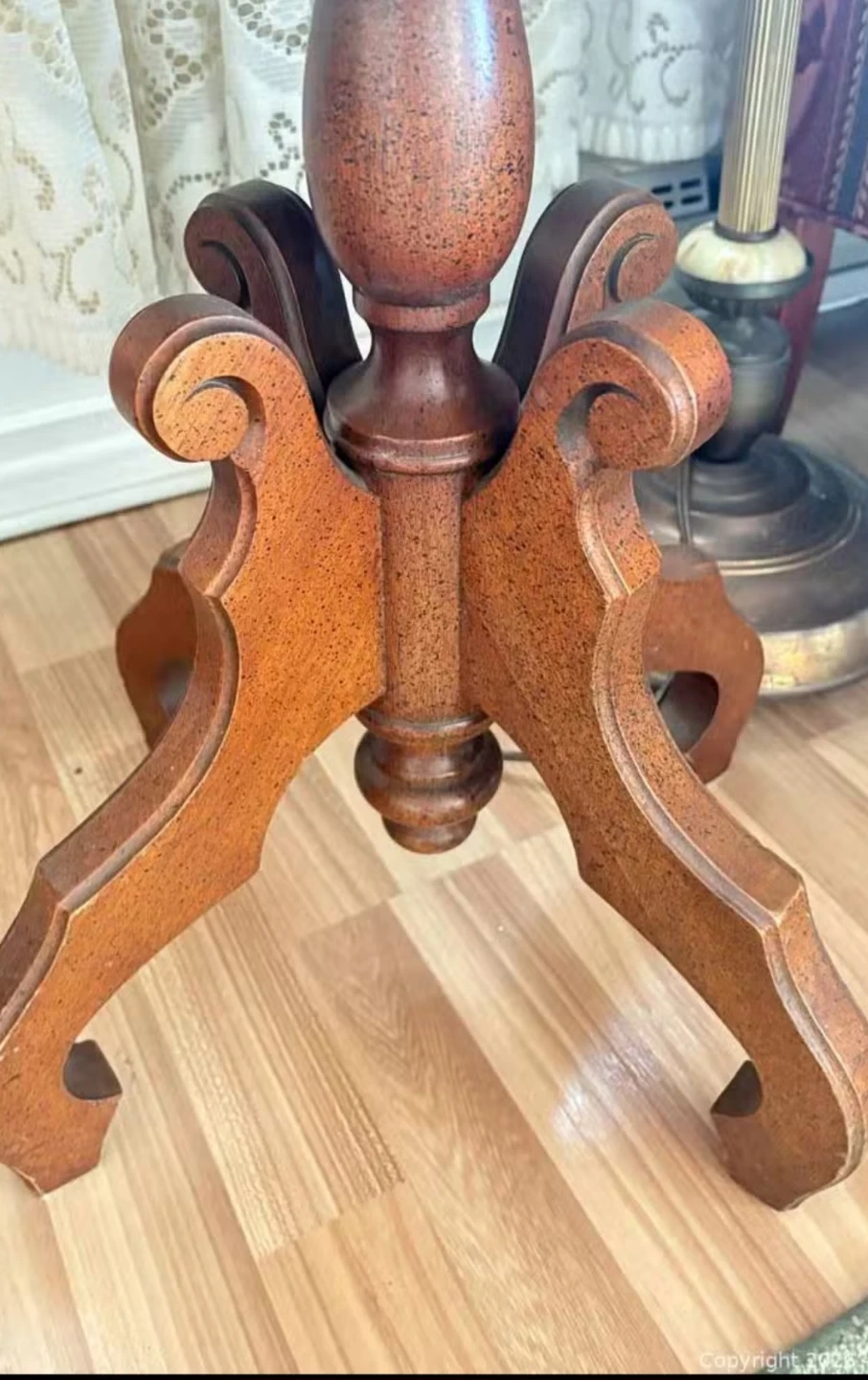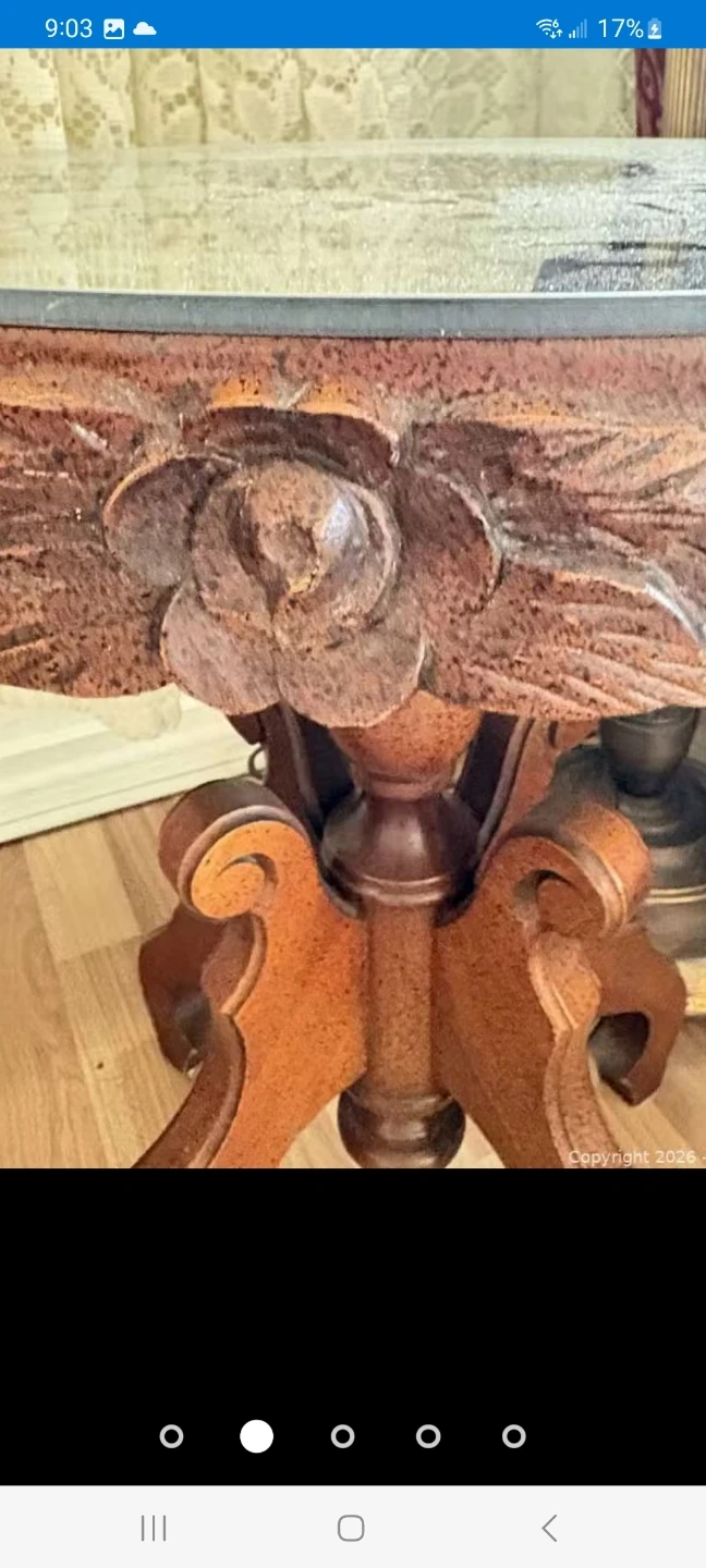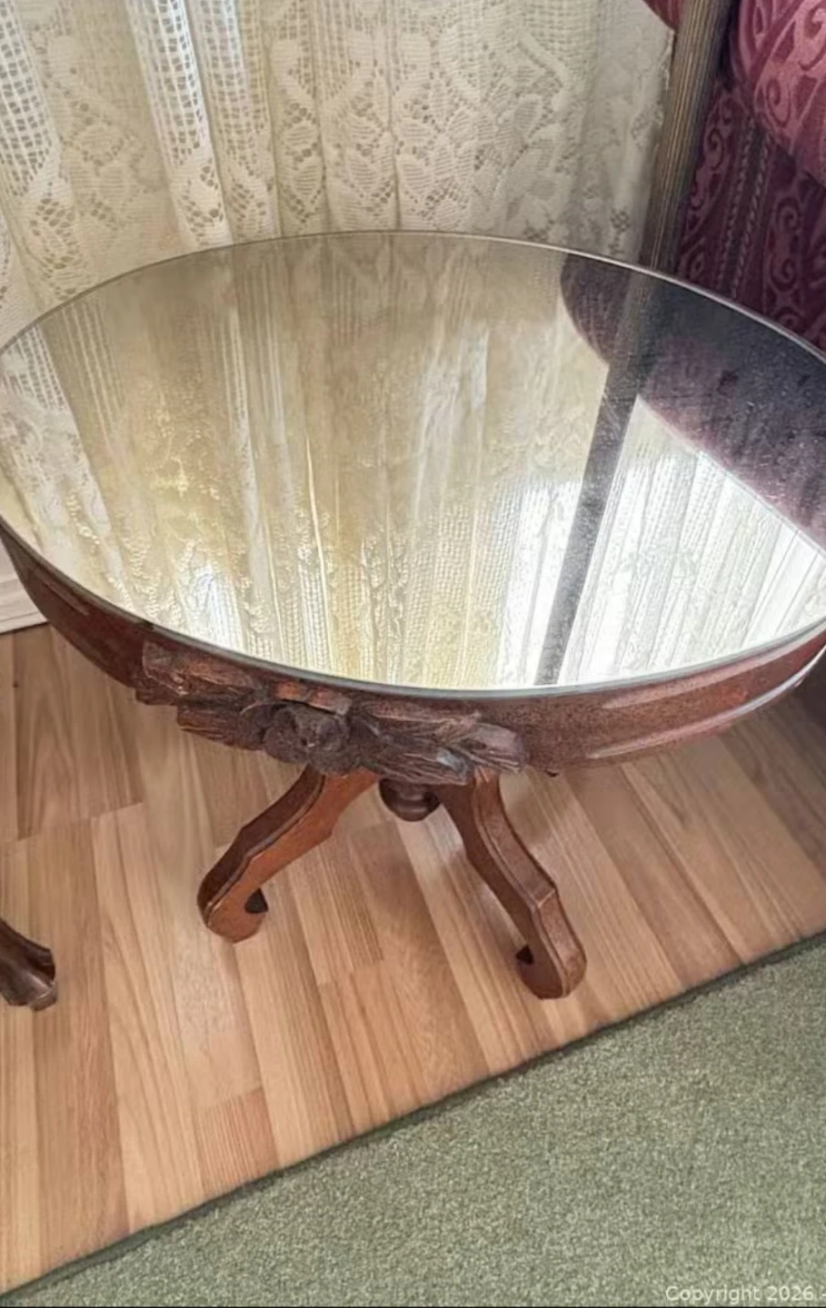 Accent table features a round glass top and a wooden pedestal base with carved floral details. It's a lovely piece for any living room or entryway. The wooden construction offers durability, and its classic design complements various decor styles. Delivery can be arranged. Viewing and pickup by appointment.