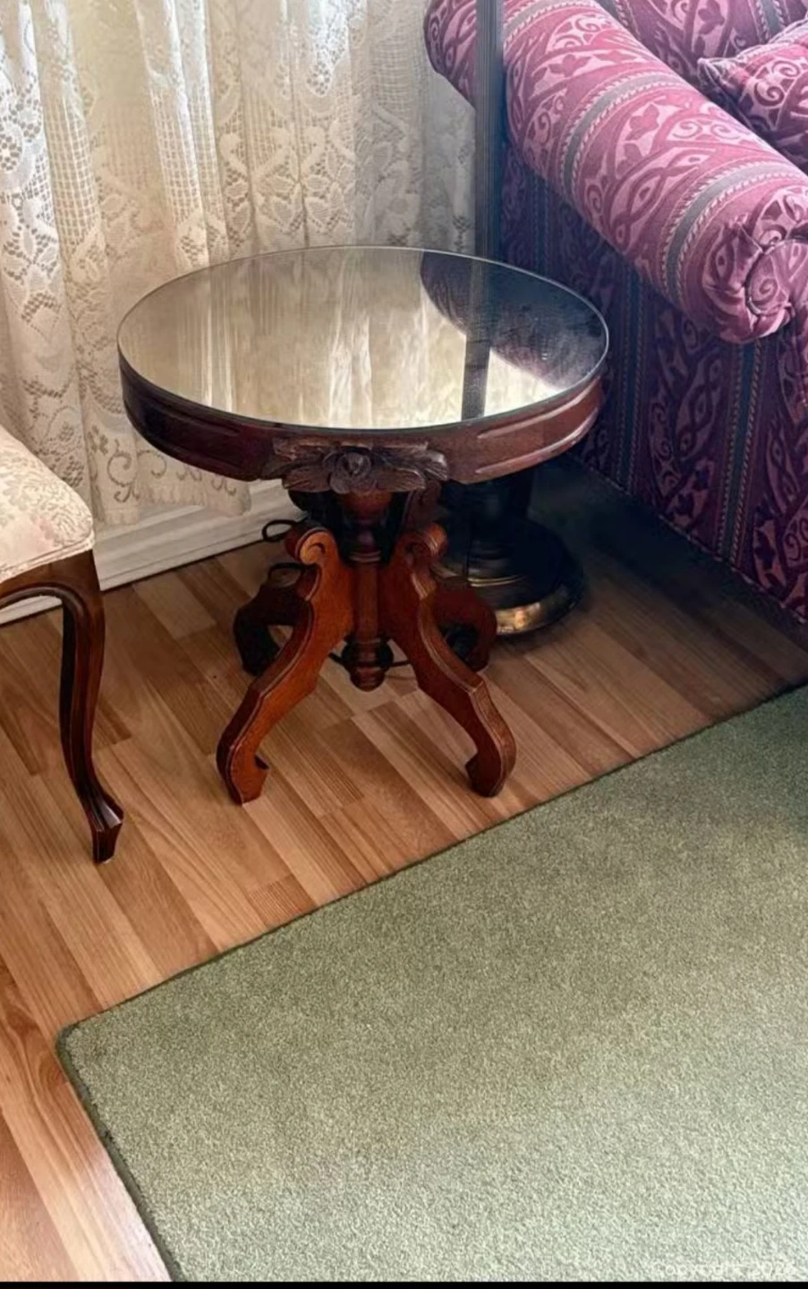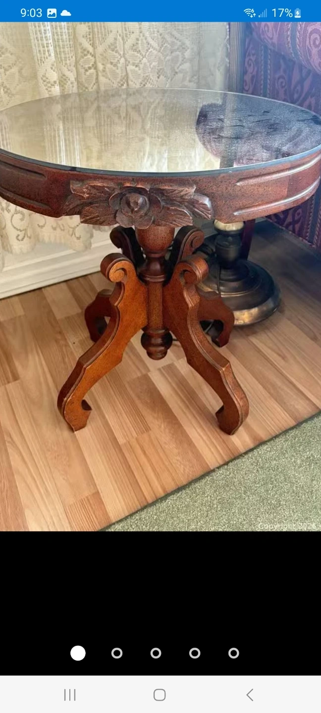 Accent table features a round glass top and a wooden pedestal base with carved floral details. It's a lovely piece for any living room or entryway. The wooden construction offers durability, and its classic design complements various decor styles. Delivery can be arranged. Viewing and pickup by appointment.