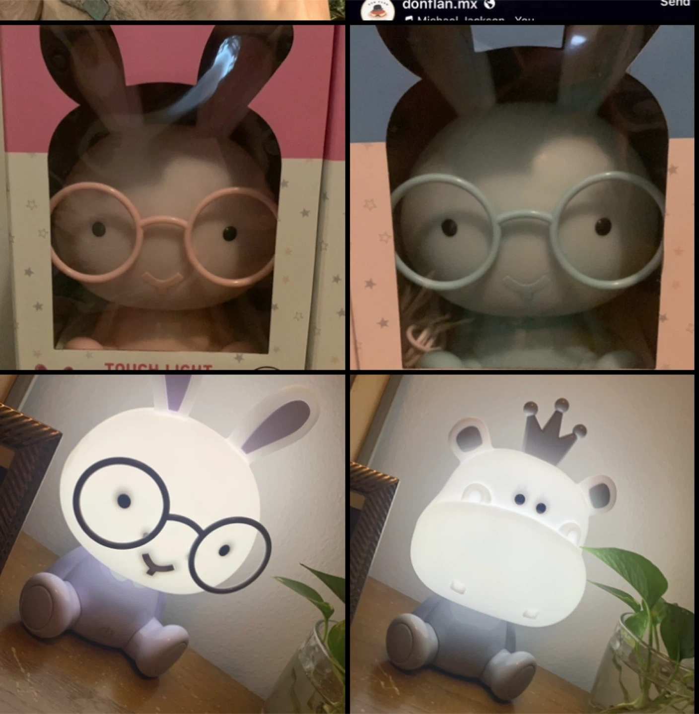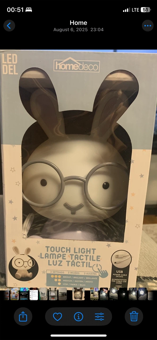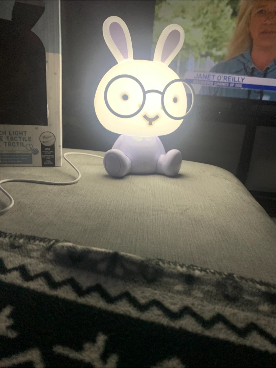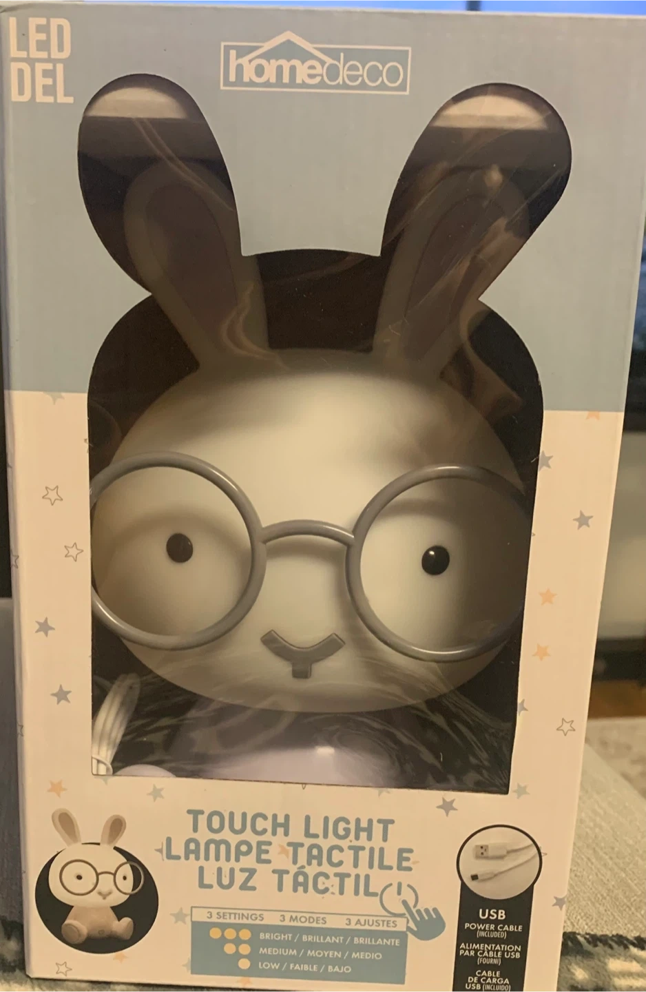 This is a Homco touch light shaped like a bunny wearing glasses. It offers three brightness settings. It's powered by USB and comes with a charging cable.
