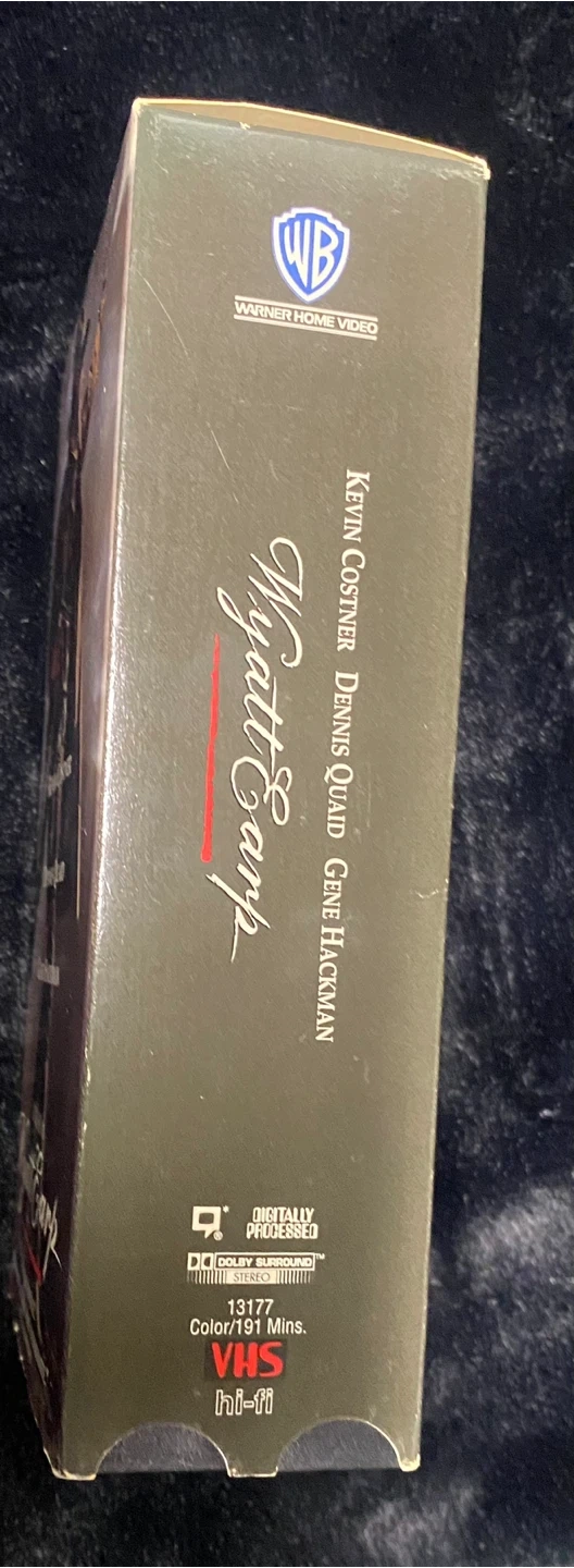 This is the VHS release of the Western film Wyatt Earp, starring Kevin Costner and Dennis Quaid. It's a 191-minute, full-colour movie. The box includes Dolby Surround Sound and Hi-Fi stereo.