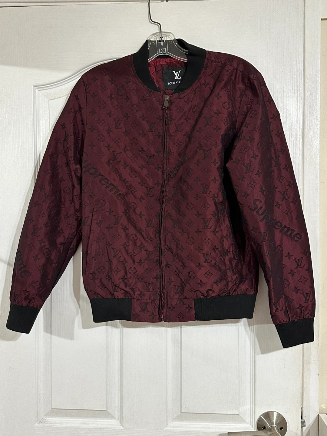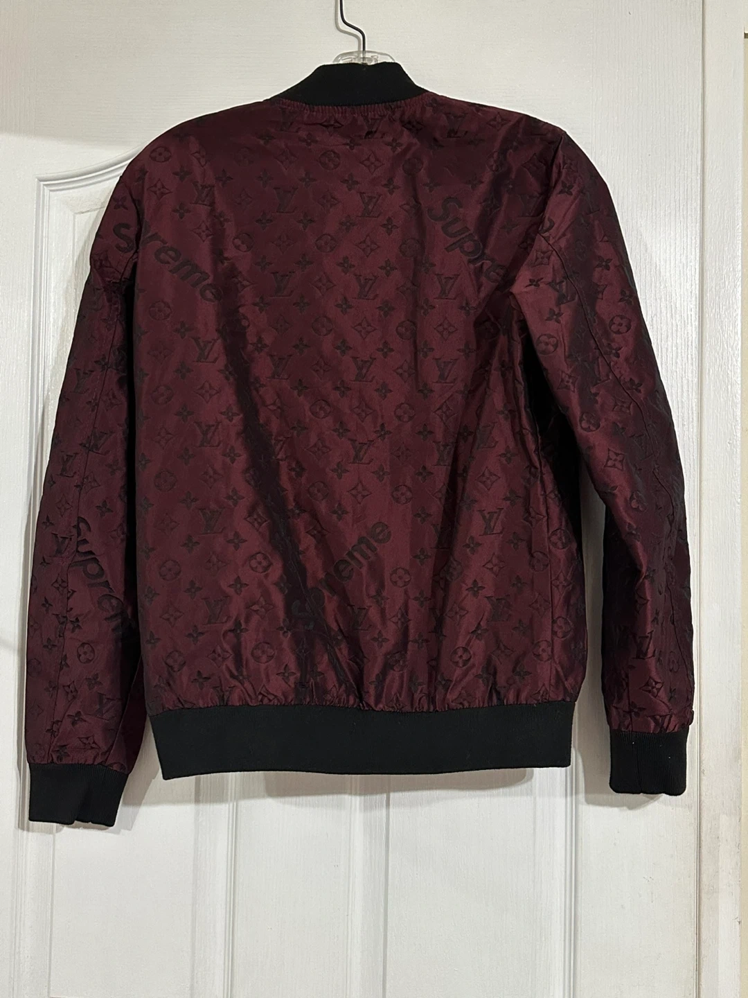 This is a Louis Vuitton x Supreme bomber jacket in a burgundy colour. It features the signature LV monogram print mixed with Supreme branding. Elasticated cuffs and hem. Zipper closure.