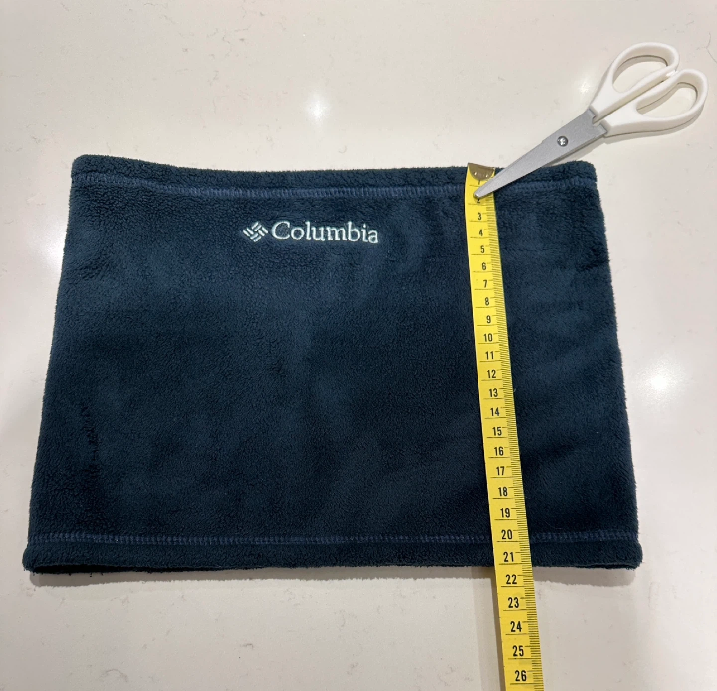 Unisex Columbia fleece neck warmer in navy blue. Soft, warm, and comfortable. Approx. Ideal for staying warm outdoors.