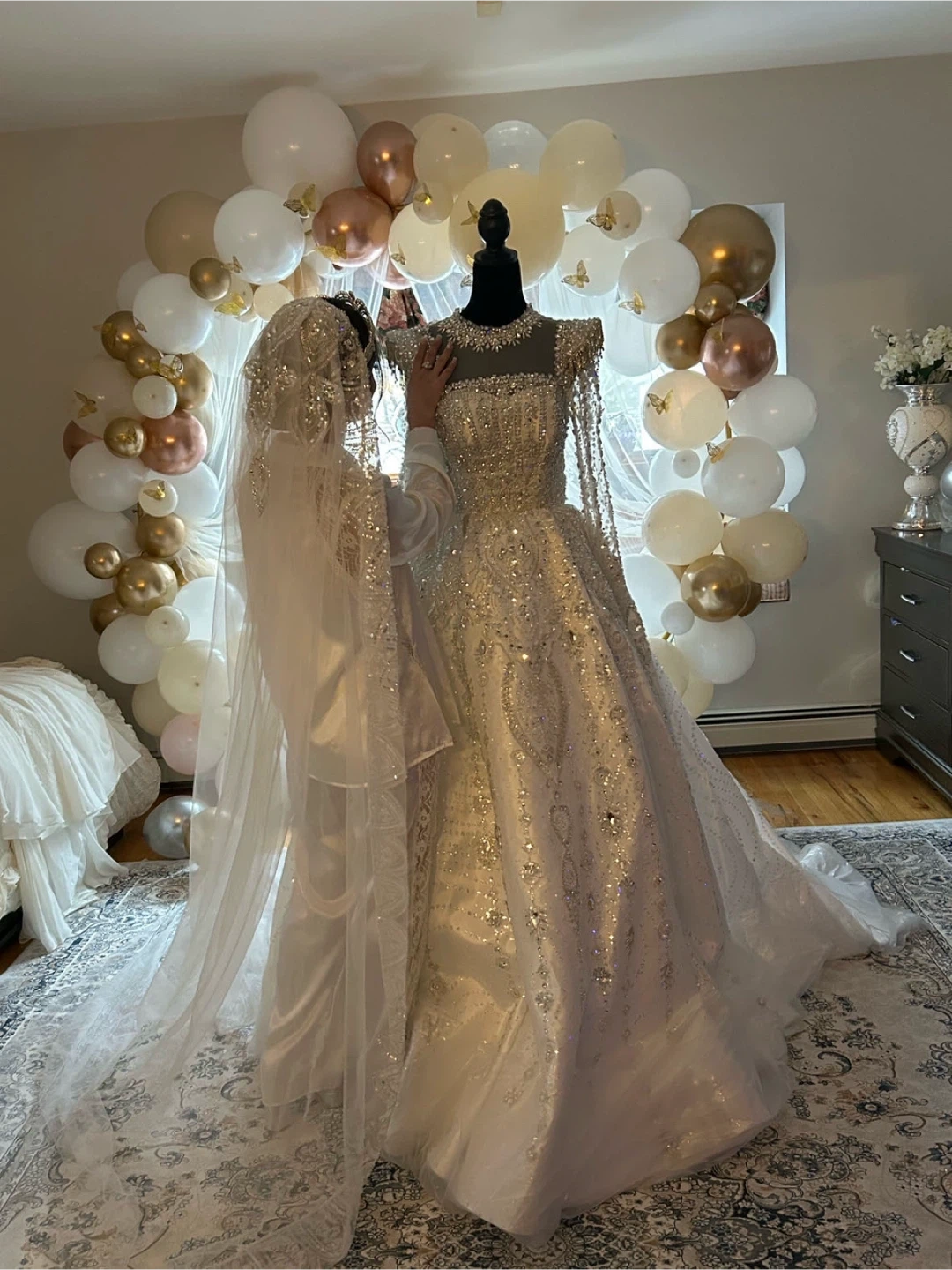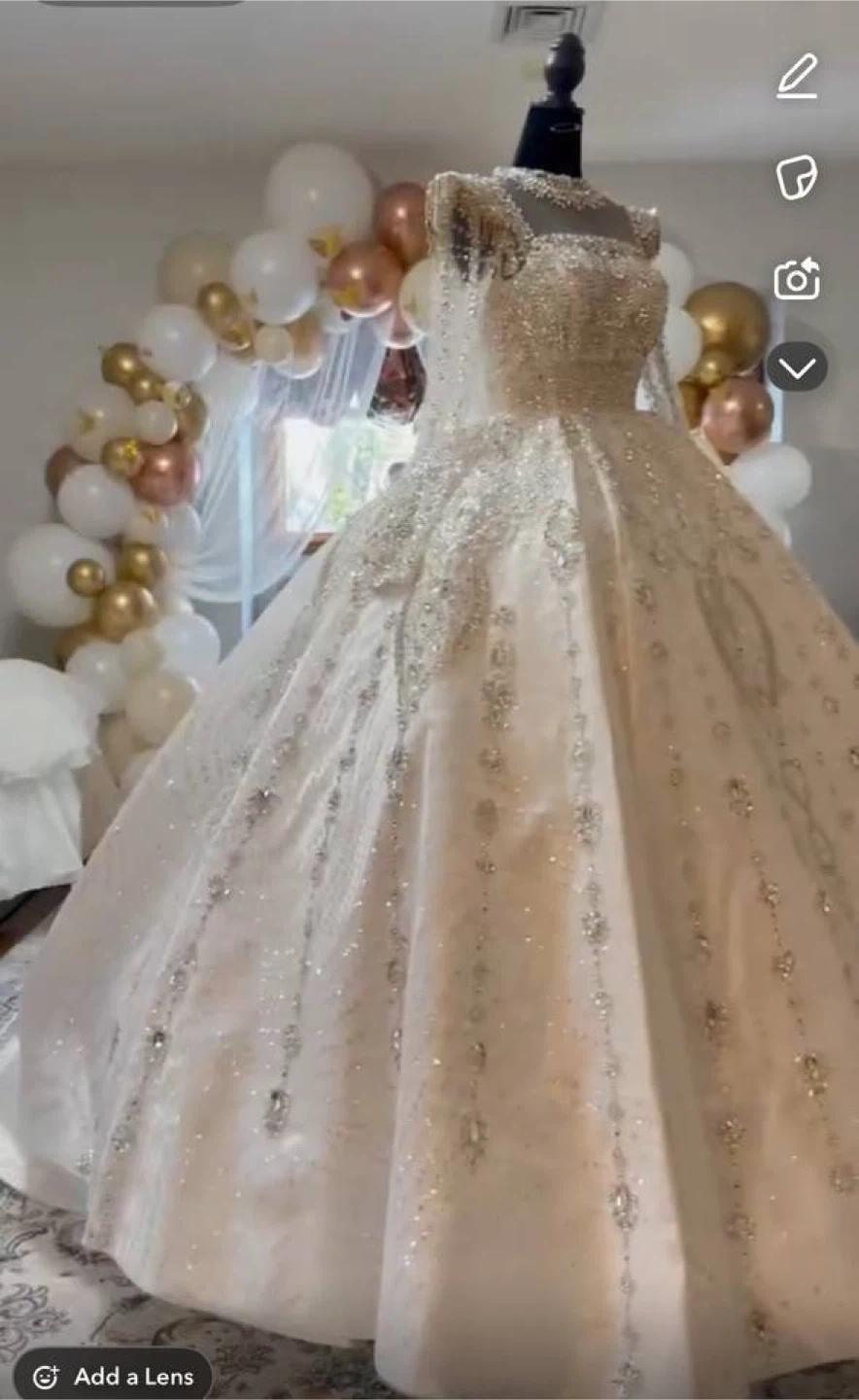 This stunning white ball gown features intricate beadwork and sparkling embellishments throughout. It has a full, sweeping skirt and a fitted bodice with illusion detailing. Perfect for a fairytale wedding!