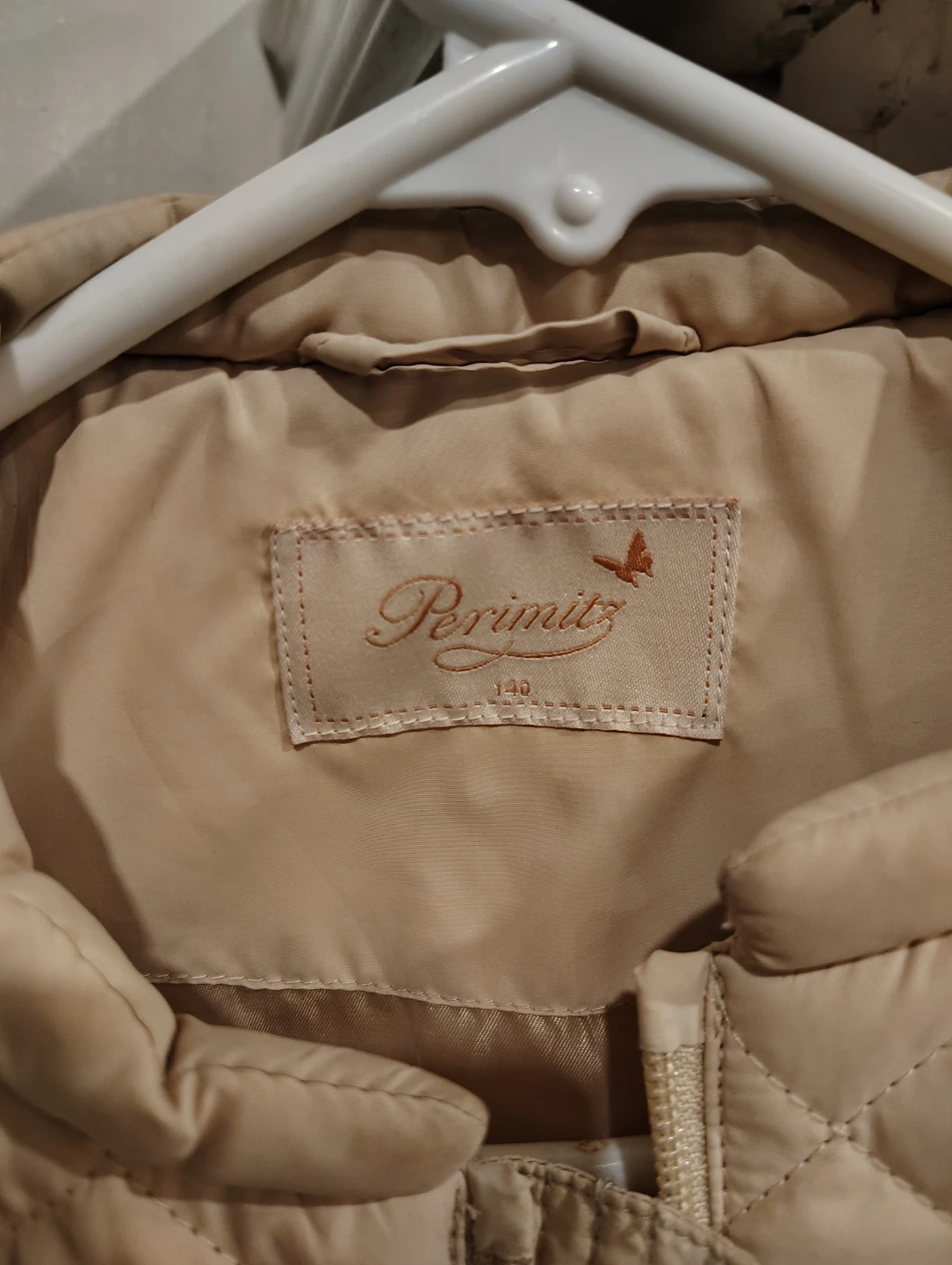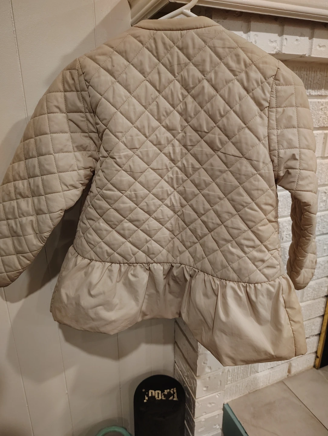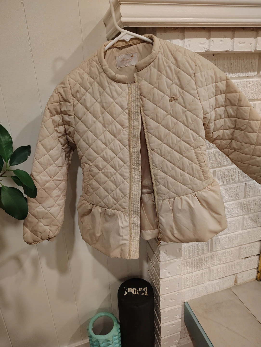 This is a quilted jacket from Perlimpinpin in a light beige colour. It's a size 140 with a pretty ruffle hem. It zips up the front. (9~10years)
