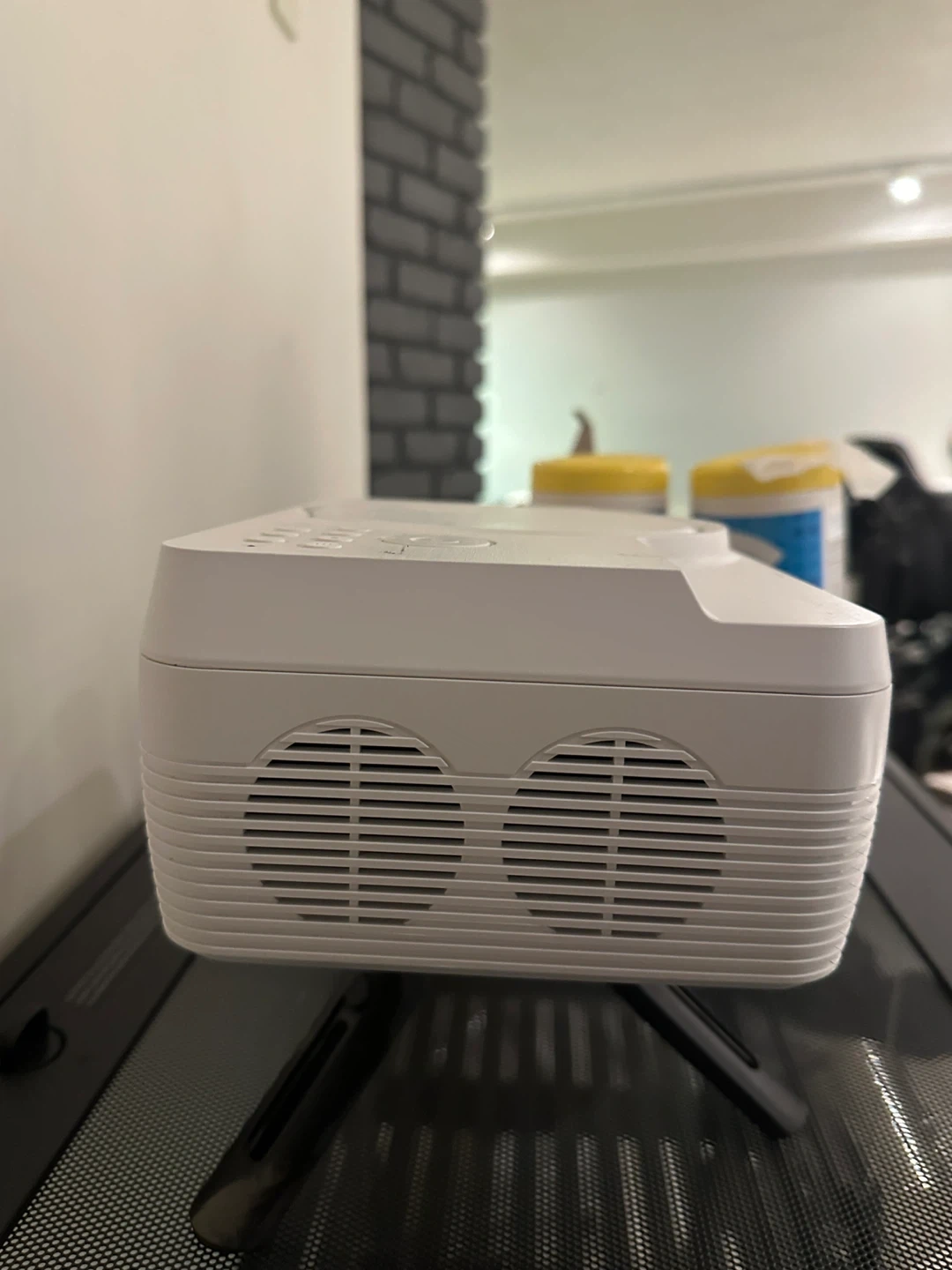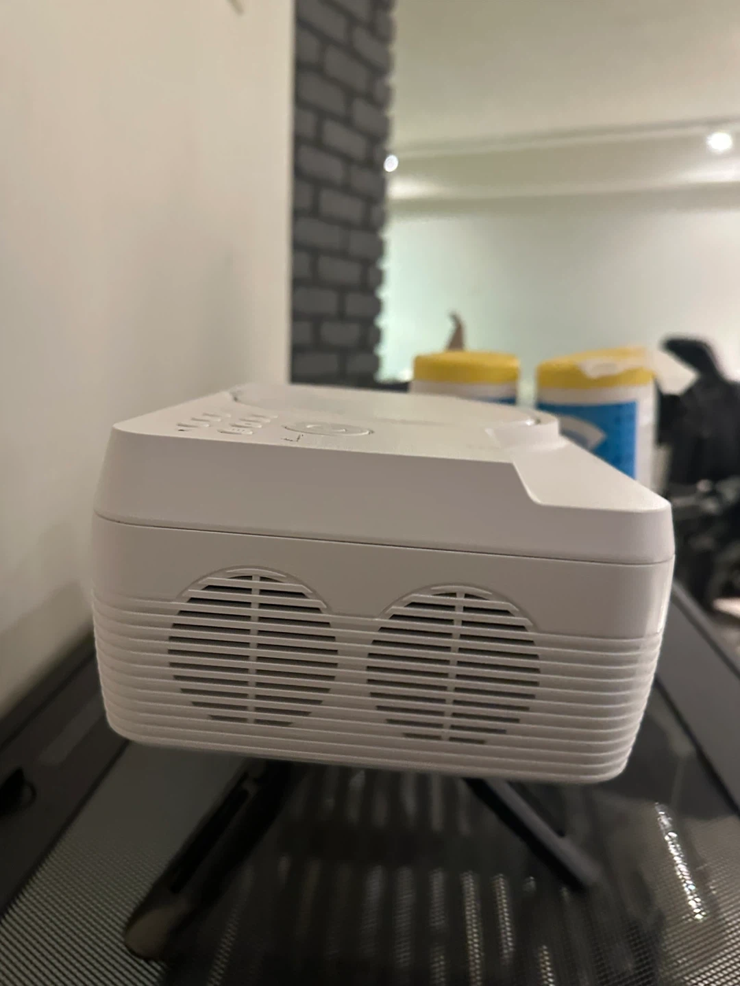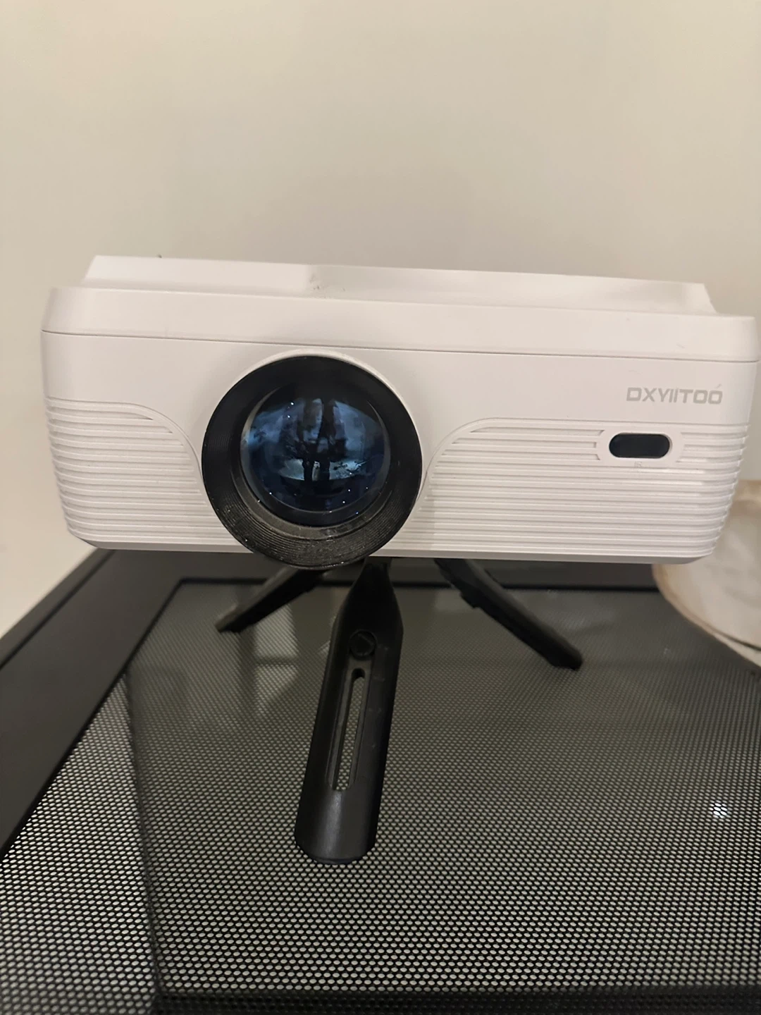 DXYItoo white projector with built-in speakers. Comes with a tripod stand. Perfect for movie nights or presentations! Brand new never used. Comes with a remote aswell!