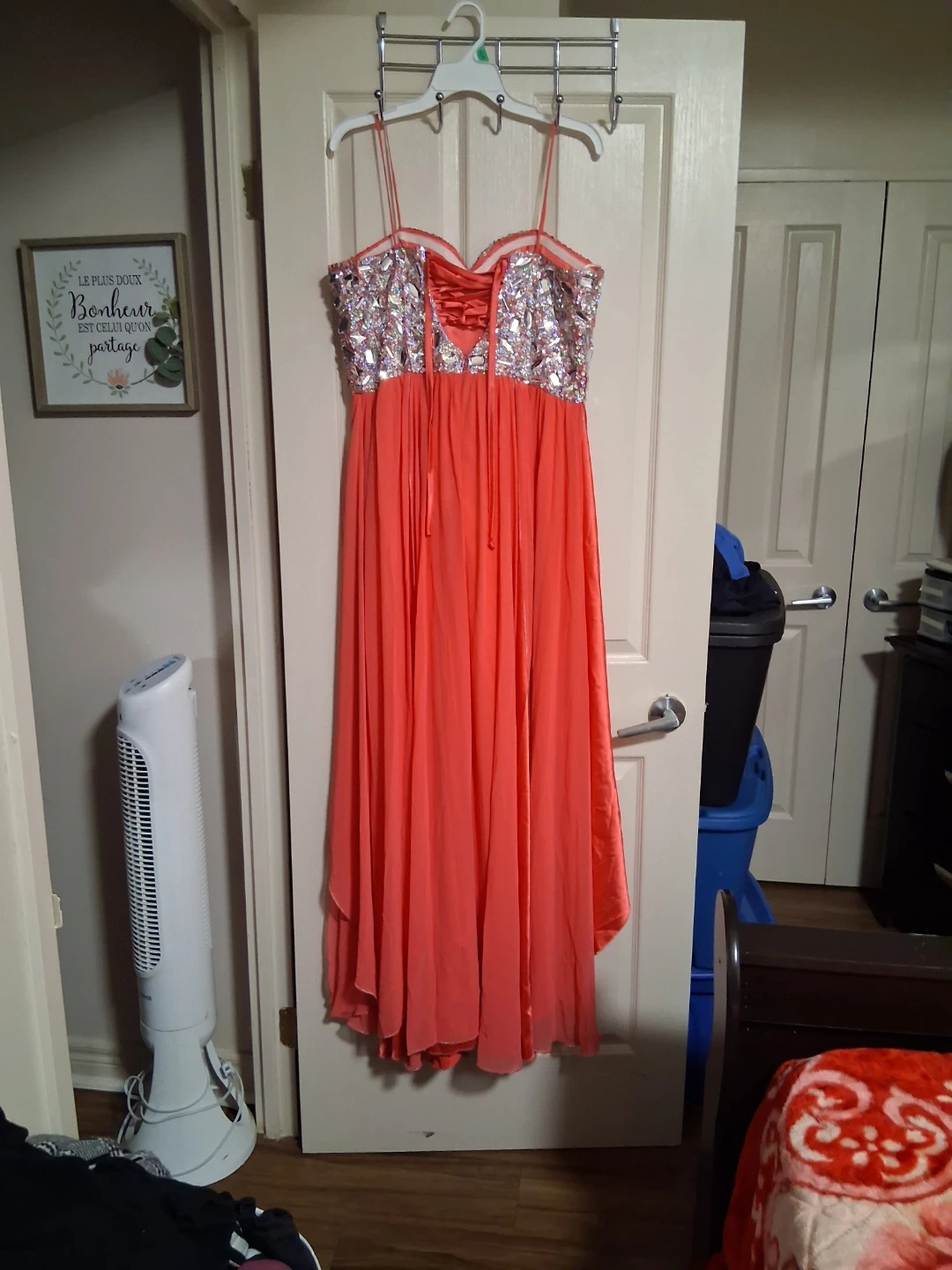 A stunning coral formal dress with a heavily beaded halter neckline. It features a flowing chiffon skirt and a lace-up back detail. This dress is perfect for proms, weddings, or any special occasion!