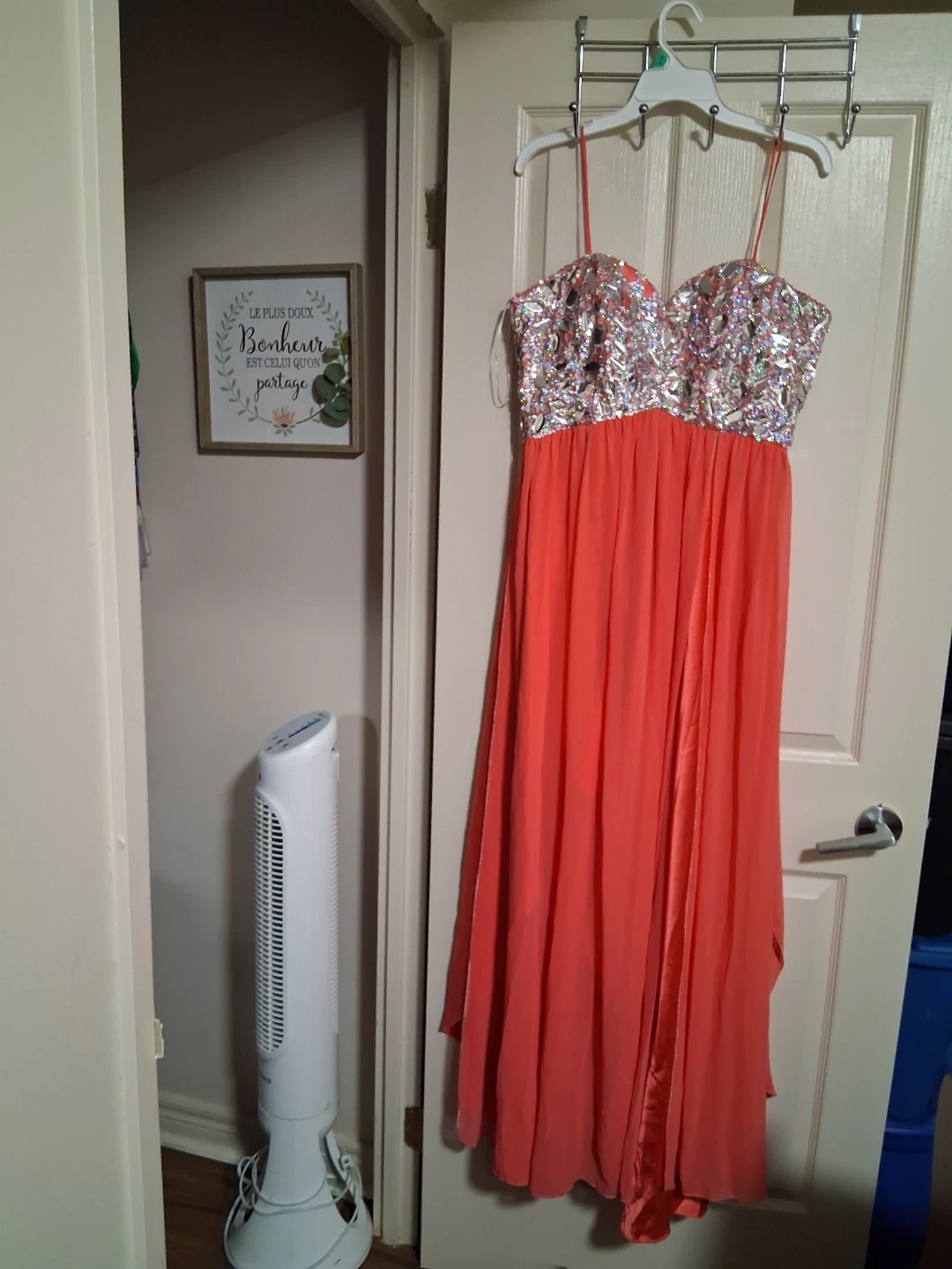 A stunning coral formal dress with a heavily beaded halter neckline. It features a flowing chiffon skirt and a lace-up back detail. This dress is perfect for proms, weddings, or any special occasion!