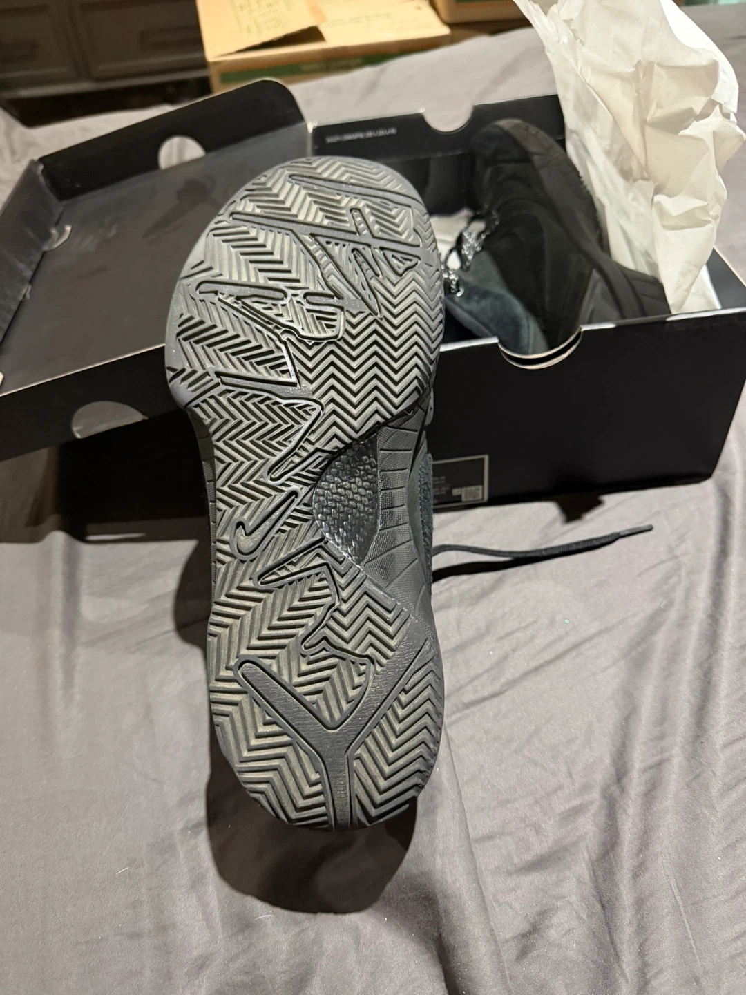 Black Nike basketball shoes are included in their original box. These sneakers feature a durable rubber sole and a lace-up closure. They're made with a mix of suede and synthetic materials.
