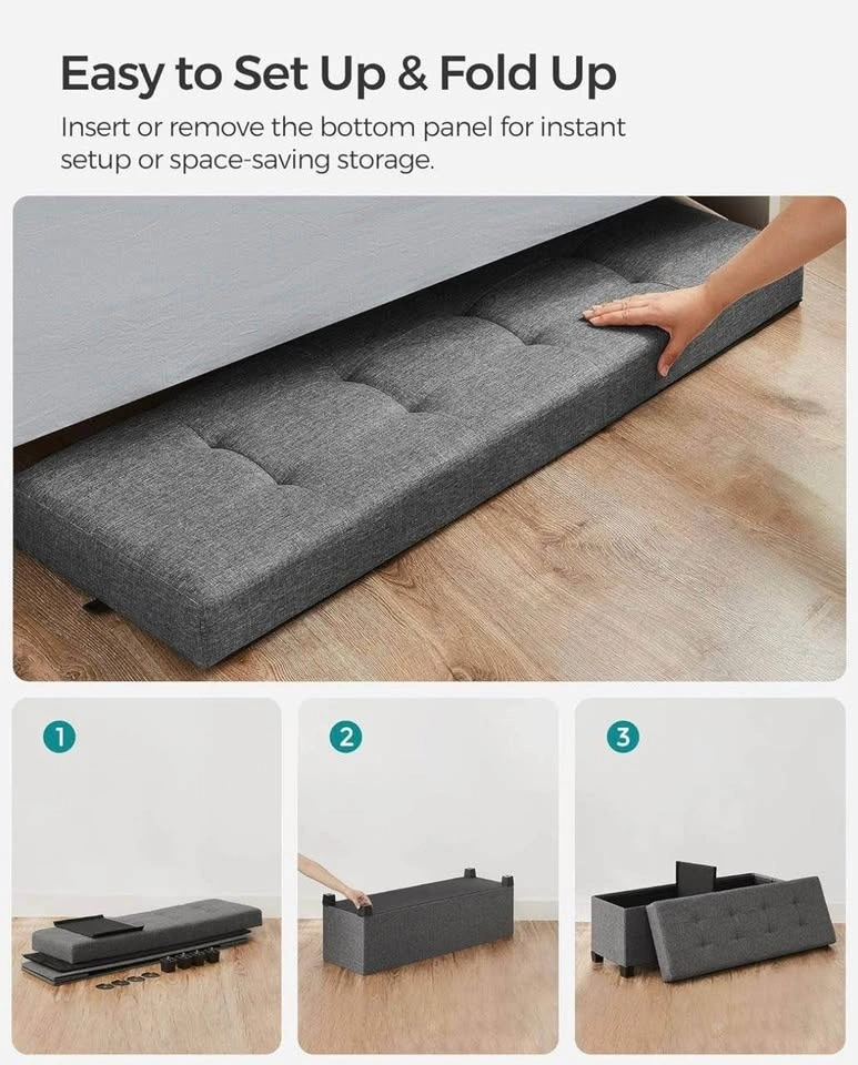 Hidden storage and extra seating in one. Perfect for bedroom, living room, or entryway. Supports up to 300 kg (660 lb). Foldable design with sturdy legs. Modern slate gray color. Brand new, never used, in box. Pick up in Riverbend (SE Calgary). Message me.