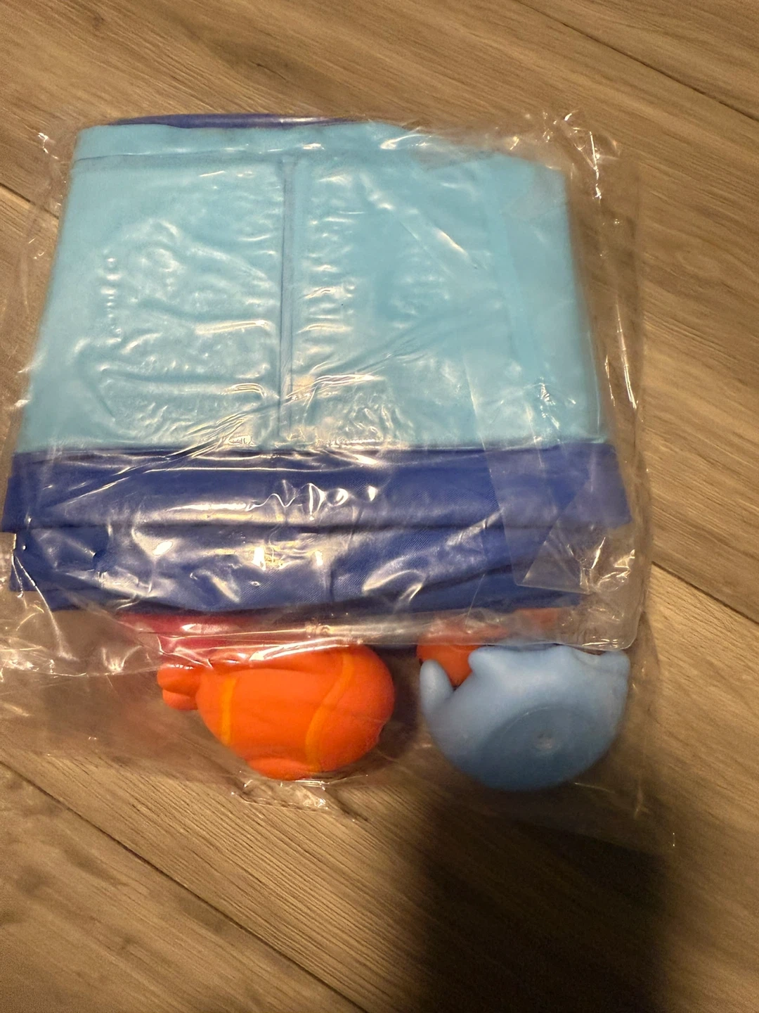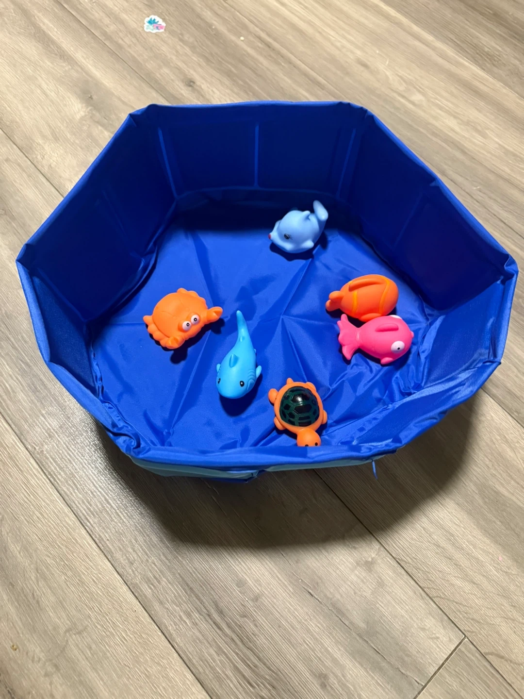 This foldable pet pool comes with 6 different water toys for your furry friend to enjoy. It's 4 inches tall and 11.8 inches wide. Great for keeping pets entertained during bath time!