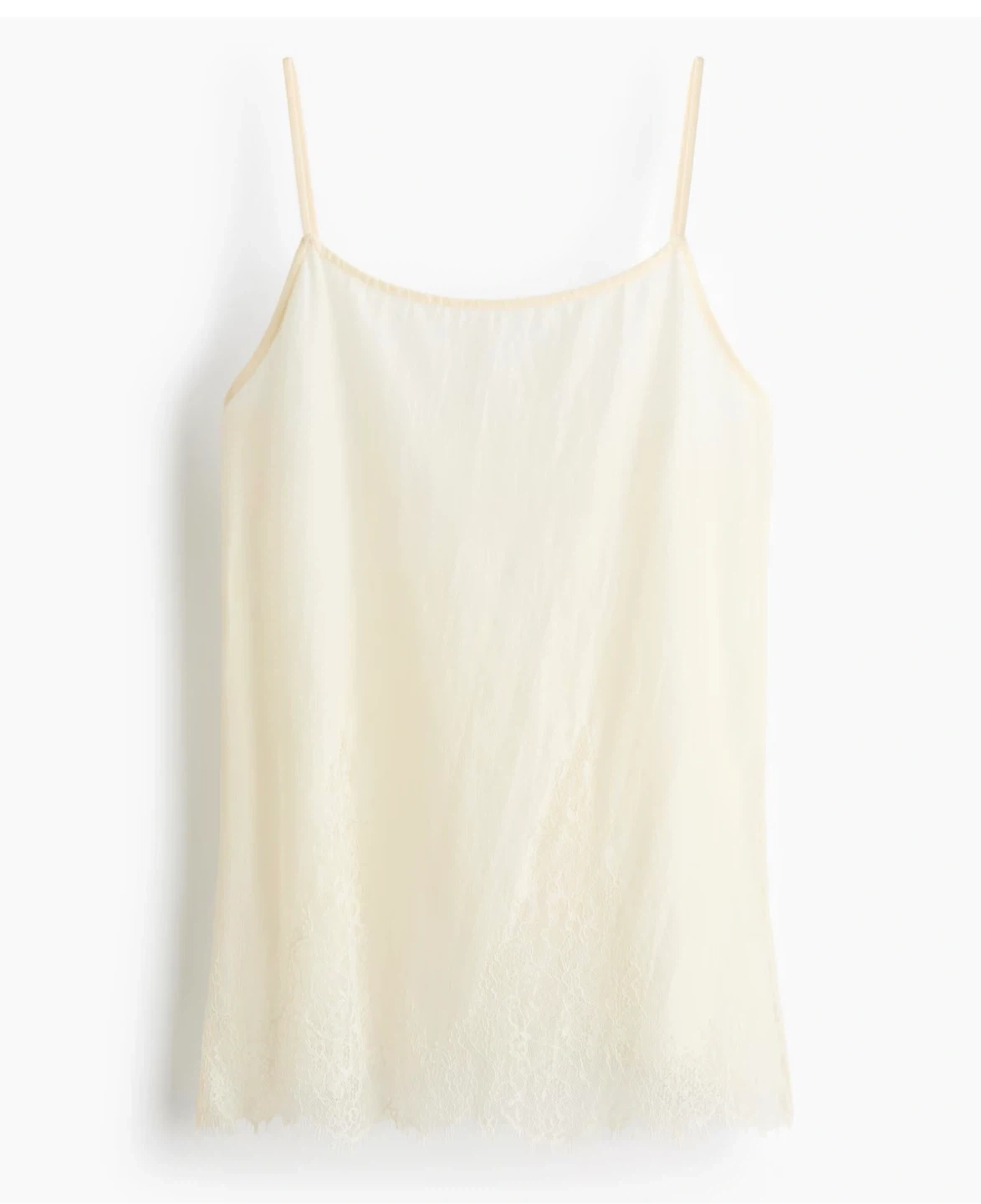 Cream camisole with adjustable spaghetti straps. It features a delicate lace trim along the hem. Made from a lightweight fabric, it's comfortable for layering.